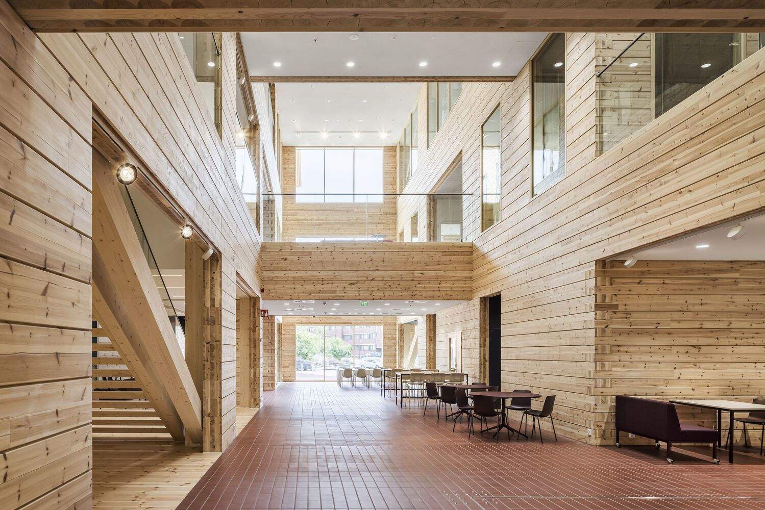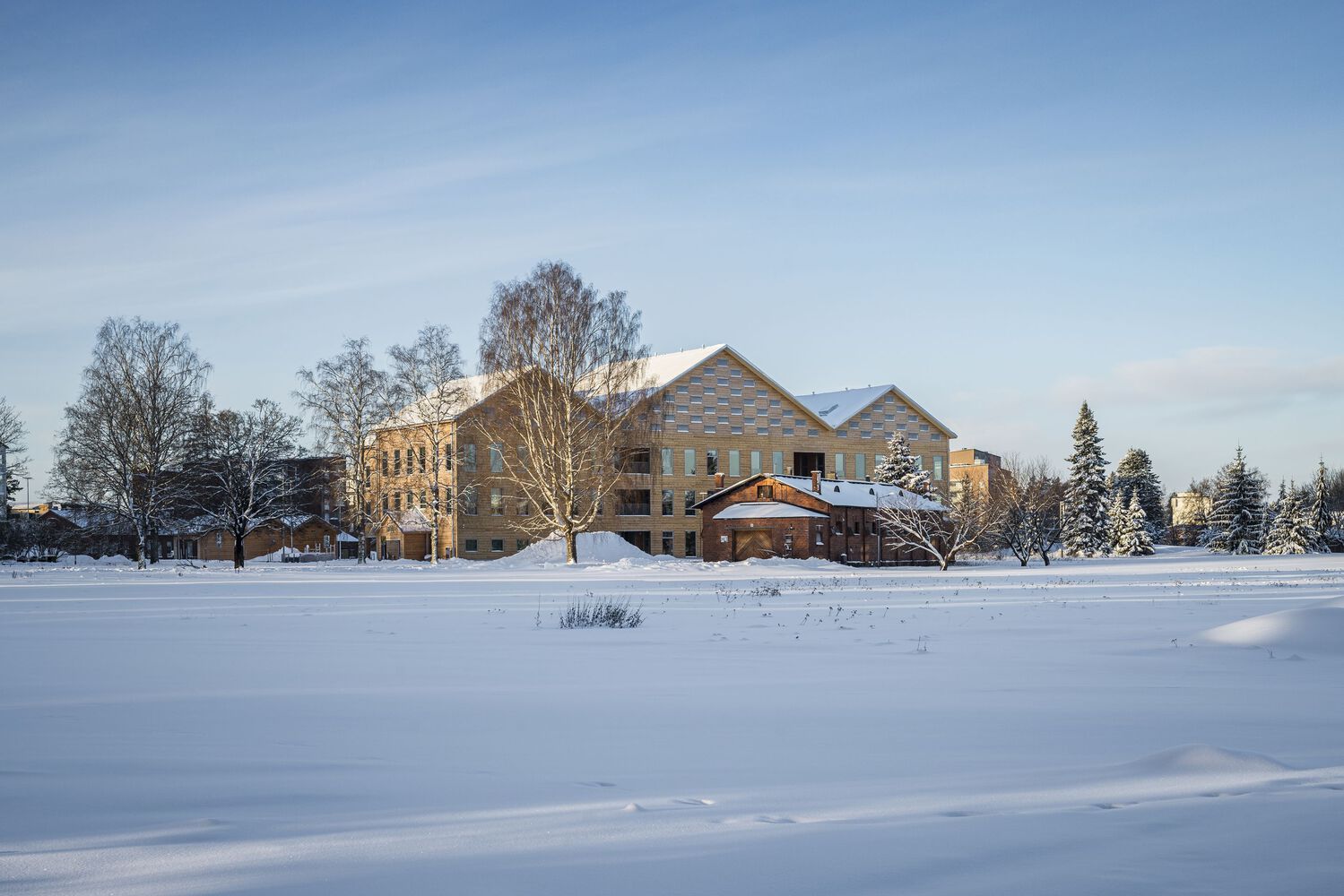 莫尼奥(Monio)是芬兰首座三层原木结构的公共建筑,也是一种全新的木构建筑类型,它将其他木构建造方法与原木框架相结合。该项目可被视为在大型公共建筑规模上对工业原木应用的一次大胆实验。其建筑设计深深植根于材料本身,更具体地说,是植根于原木的使用。该建筑由六座相连的原木房屋构成,这些房屋环绕着一个高大的内部街道网络,形成了主大厅。原木房屋的外墙和朝向内部的隔墙均采用 275 毫米厚的交叉层压无沉降原木建造。外墙无需额外添加保温材料,因为厚重的木结构既构成了承重结构,又起到了保温作用,同时还是墙体完成后的内、外表面。该项目于 2022 年荣获“年度建筑工地奖”,并于 2023 年获得“芬兰木材奖”。