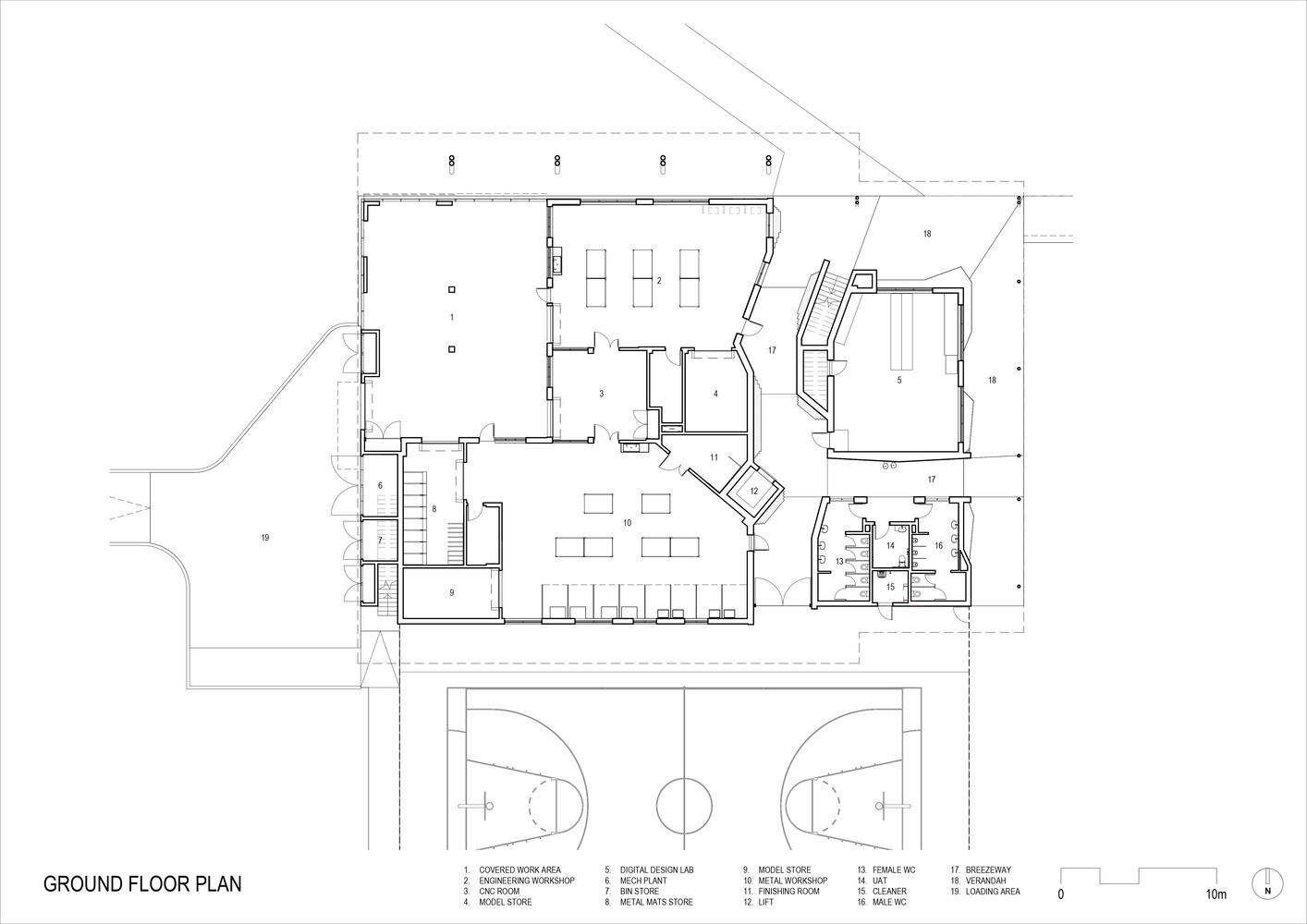 这座全新的技术学习设施与现有的室外运动场地相连,提供了遮风避雨的观赛空间、更衣室,以及供人们在锻炼间隙休息纳凉的场所。一处现有的岩石洼地被改造成了校园与公众共享的景观化休闲空间。