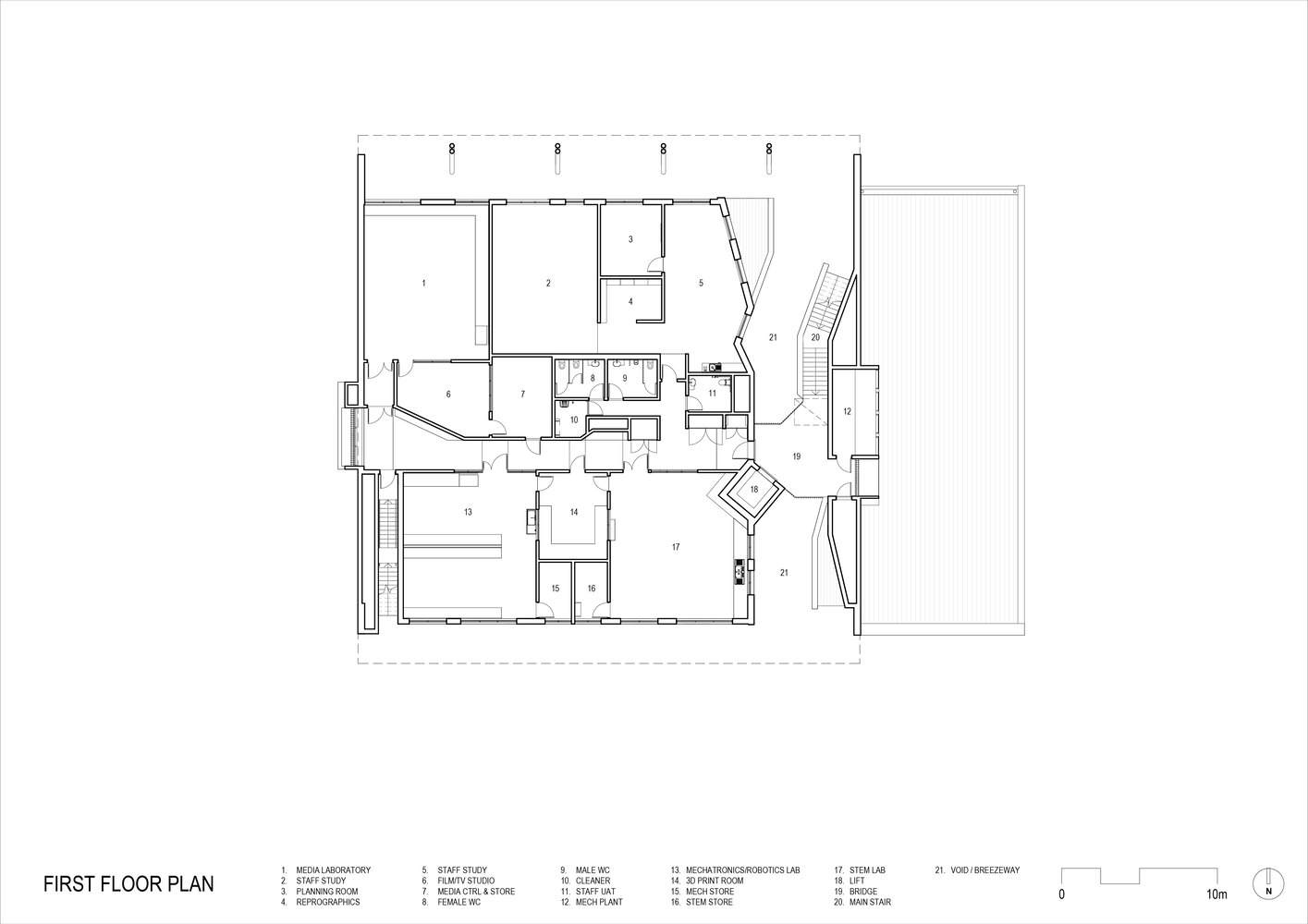 这座技术学习设施包含多种功能空间,这些空间需要完善的内部与外部服务配套、良好的隔音分隔以及无源安全监控措施。通过采用两层建筑布局,该设施在紧凑的占地面积内实现了功能整合,同时未占用宝贵的外部休闲活动空间。经济高效的设计方案还使得增设更多外部空间成为可能。一条宽大的中央有顶风廊不仅连接了不同功能区域,还引导人们的视线聚焦于远处的古老山丘。