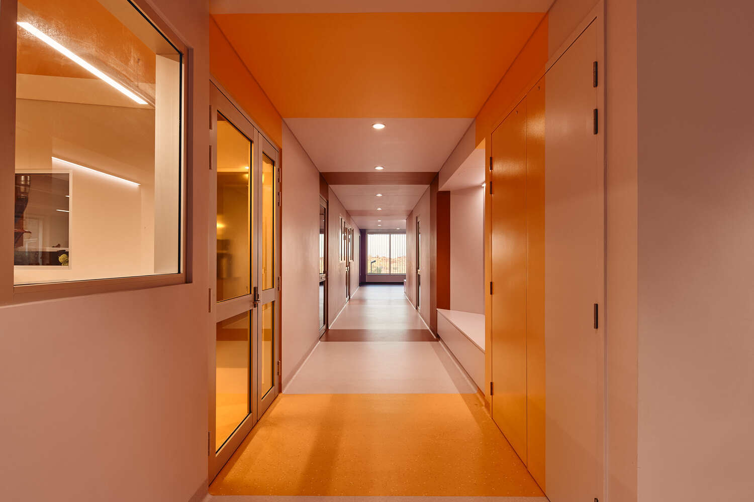上层的东西向轴线将人们的视线引向遥远的地平线,其间穿插着从相邻学习空间延伸而出的一系列彩色入口,这些入口既让人得以一窥教学空间内的景象,又在学生进入时营造出热情的迎宾氛围。