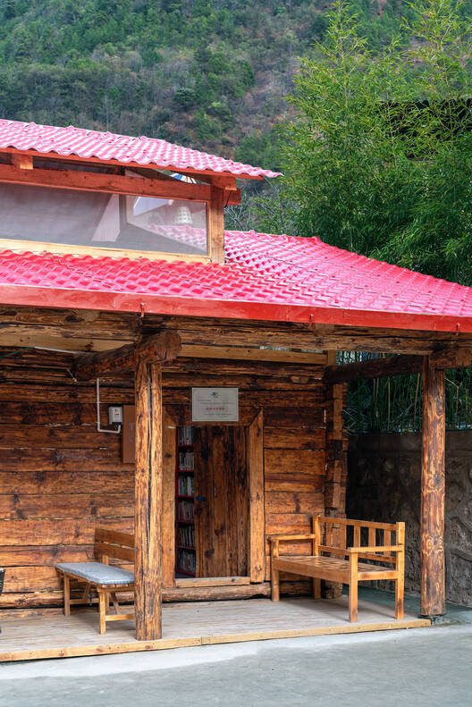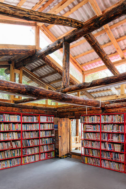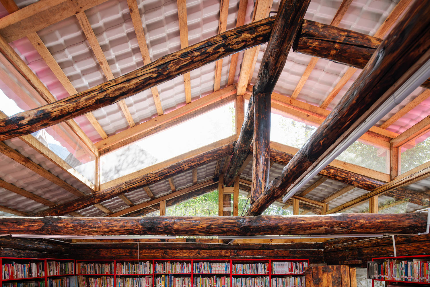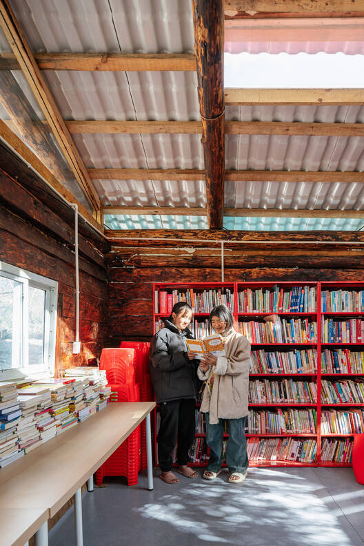 空间设计与功能改造:设计师通过对原有结构的改造,成功解决了采光和通风问题,这不仅提升了阅读空间的舒适度,也延长了书籍的使用寿命。侧向高窗和顶部天窗的设计,极大地改善了室内光线,而纱窗的运用则兼顾了通风和防蚊虫的功能。此外,设计师还巧妙地利用了红色树脂瓦和红色排水檐沟,将新改造的屋顶与老房子的传统结构在视觉上区分开来,既体现了新旧的对比,又创造出了一种独特的视觉效果。室内家具的红色选择,与木结构共同营造了温暖、和谐的阅读氛围,为孩子们创造了一个温馨的学习环境。
