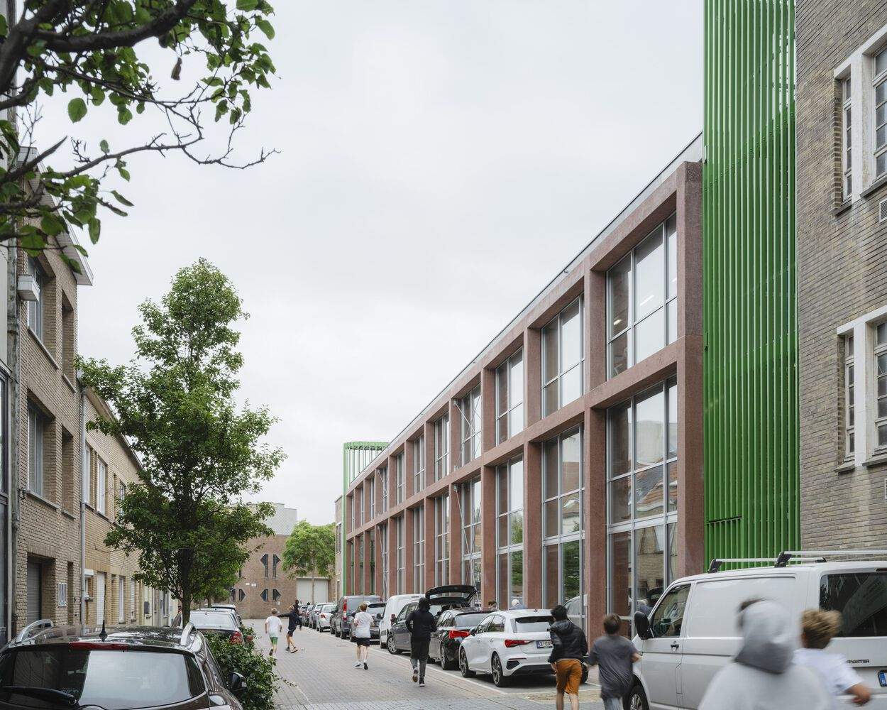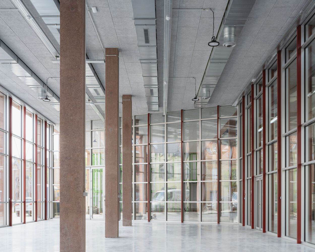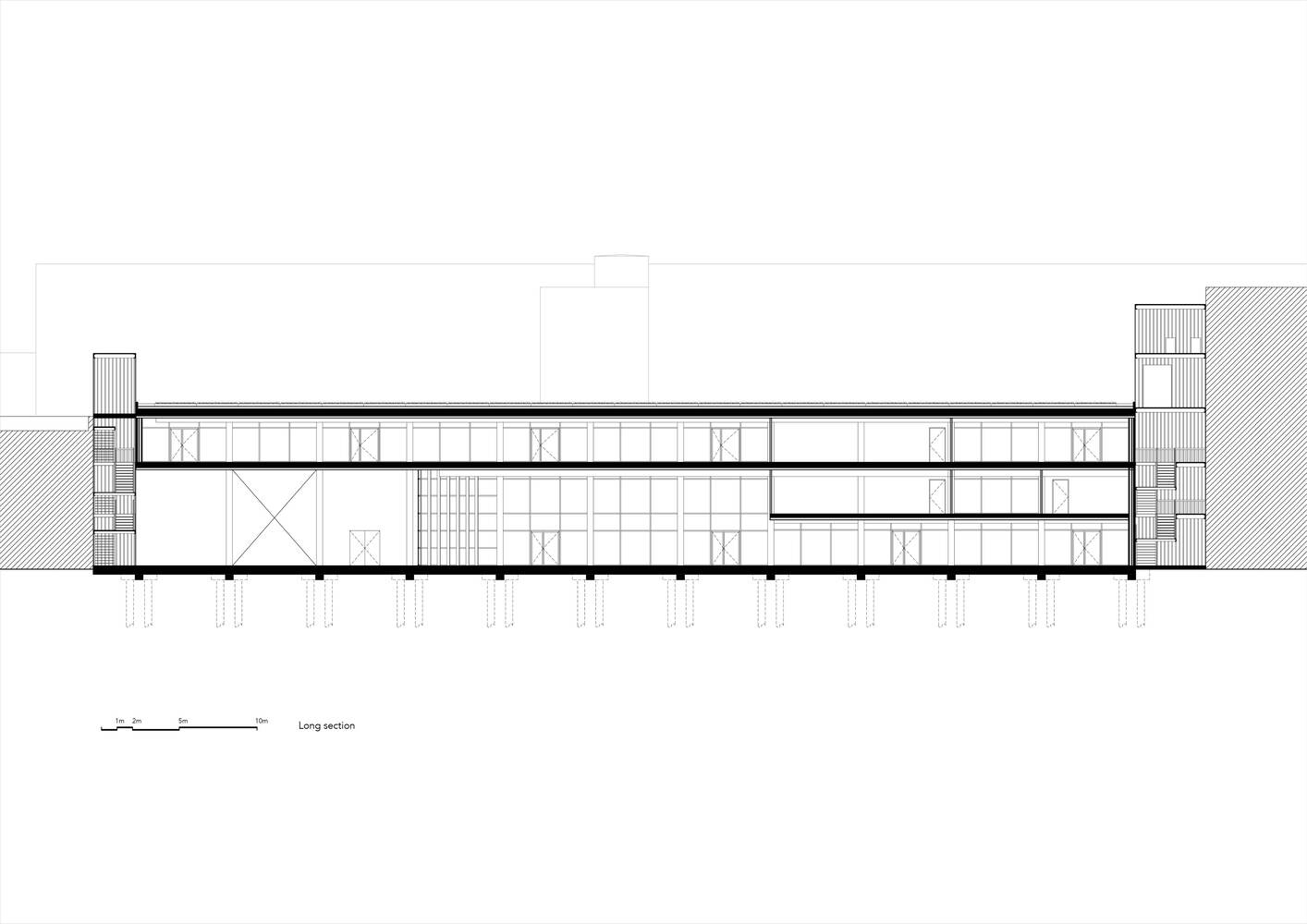 结构系统还允许底层朝向街道有一个宽敞的开口。这创造了一个有顶盖的入口区,建立了街道与通往学校入口的相邻庭院之间的联系。从建筑的立面最能理解这个结构系统,因为可以看到两个空间的框架以及相邻立面的关系和抽象表达。