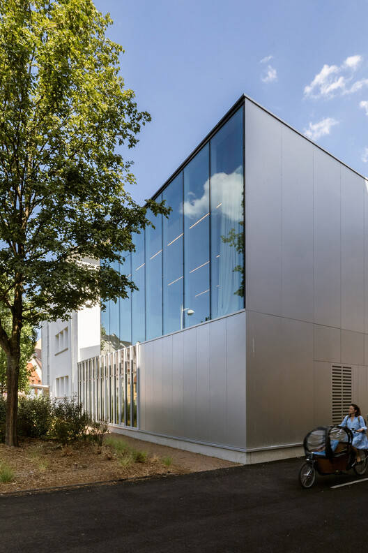 该项目设计充分尊重了现有的建筑遗产。扩建部分主要容纳幼儿园和小学学生的食堂,沿芬克维勒街而建,成为两所学校之间的共同界面,由一个庭院加以强调。设计理念是创造一种从操场“涌现”的层叠式建筑。这些层次相互交错,巧妙地将两栋学校建筑连接起来。整体建筑外观旨在呈现多孔且植被茂盛的特点。