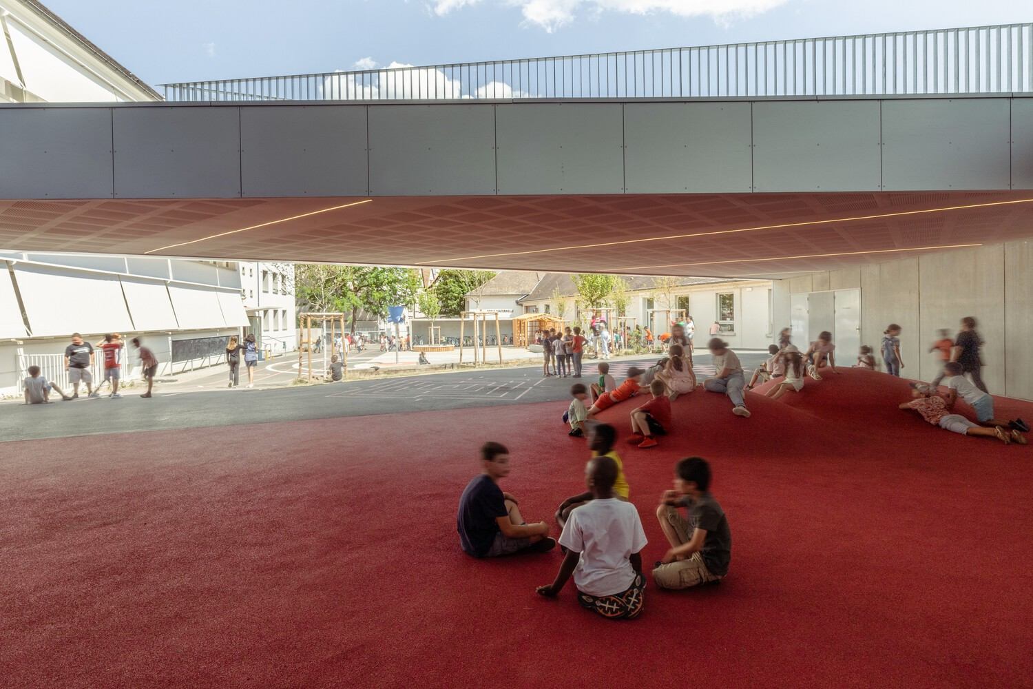 操场上的建筑形成了不同高度的多层结构,提供了充足的遮阳。玻璃表面装有与天气传感器相连的卷帘。通过进风口和屋顶窗实现自然通风,确保空气有效流通。操场设有最小范围的沥青周边,以确保通行和安全。其余部分采用透水表面,可吸收雨水。一个植被覆盖的小丘将沥青与游乐区分隔开,旁边设有菜园。靠近学校处,铺设了一片草坪作为边界标志。