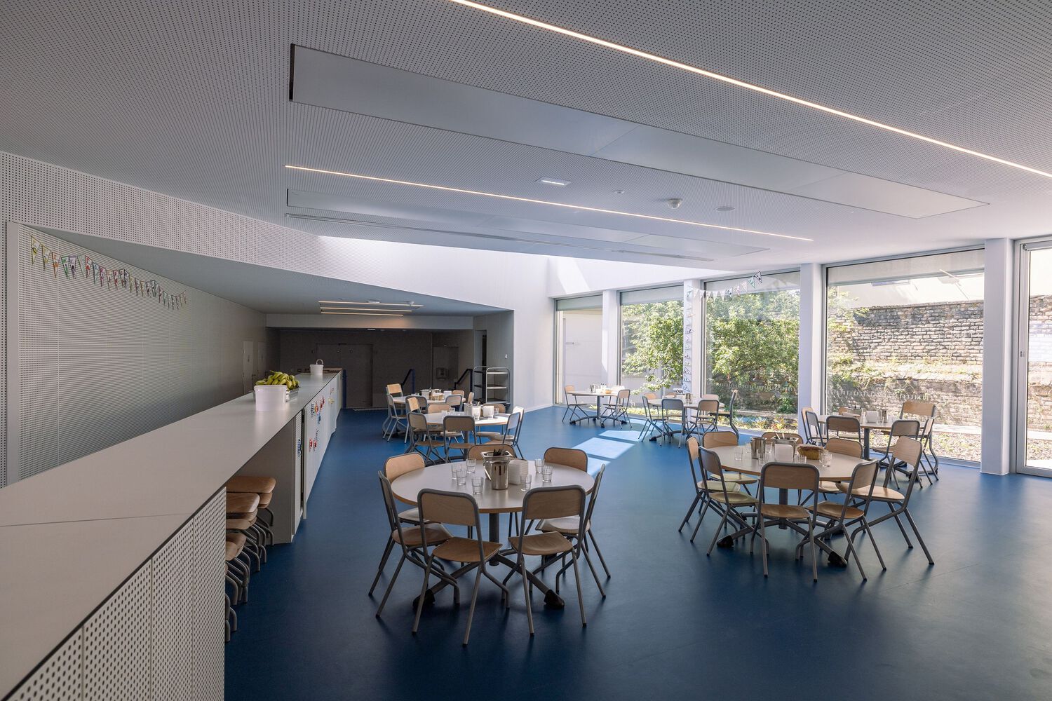 食堂位于一楼,可欣赏到多种户外景观。一楼还设有一个大厅,将现有的小学与扩建部分连接起来,通过双层高度设计,既能看到室内也能看到室外区域。多功能室在项目中脱颖而出,从芬克维勒街上就能轻松看到。室内活动通过宽敞的玻璃立面展示出来。最后,室内空间与操场之间设有带顶庭院作为过渡。该结构还可用作露台,布置有菜园,可从学校操场进入。