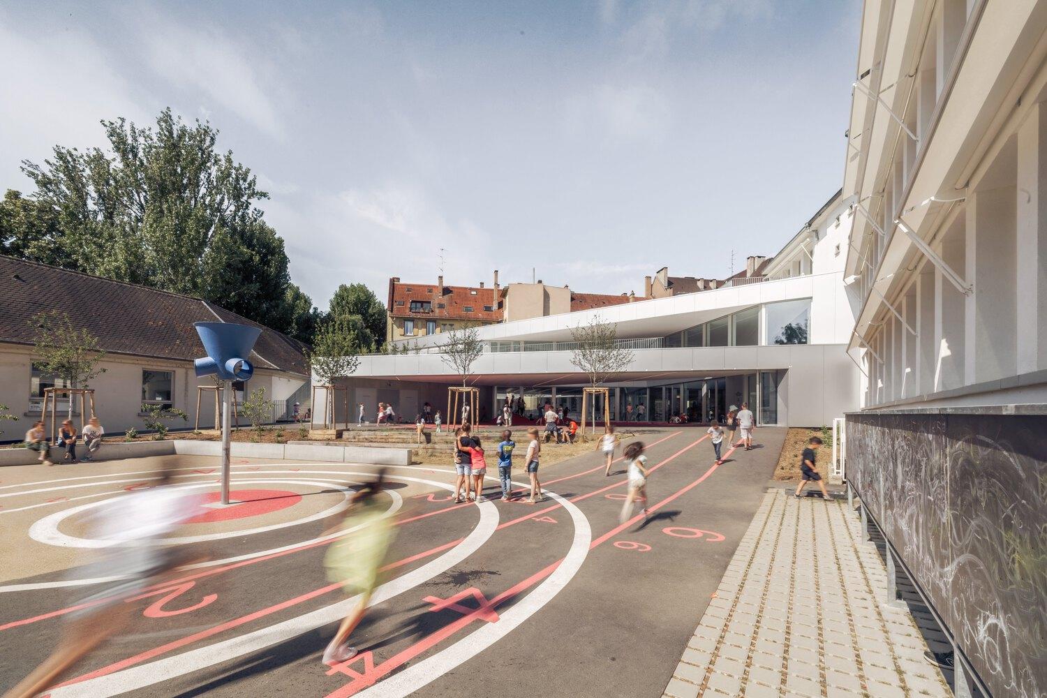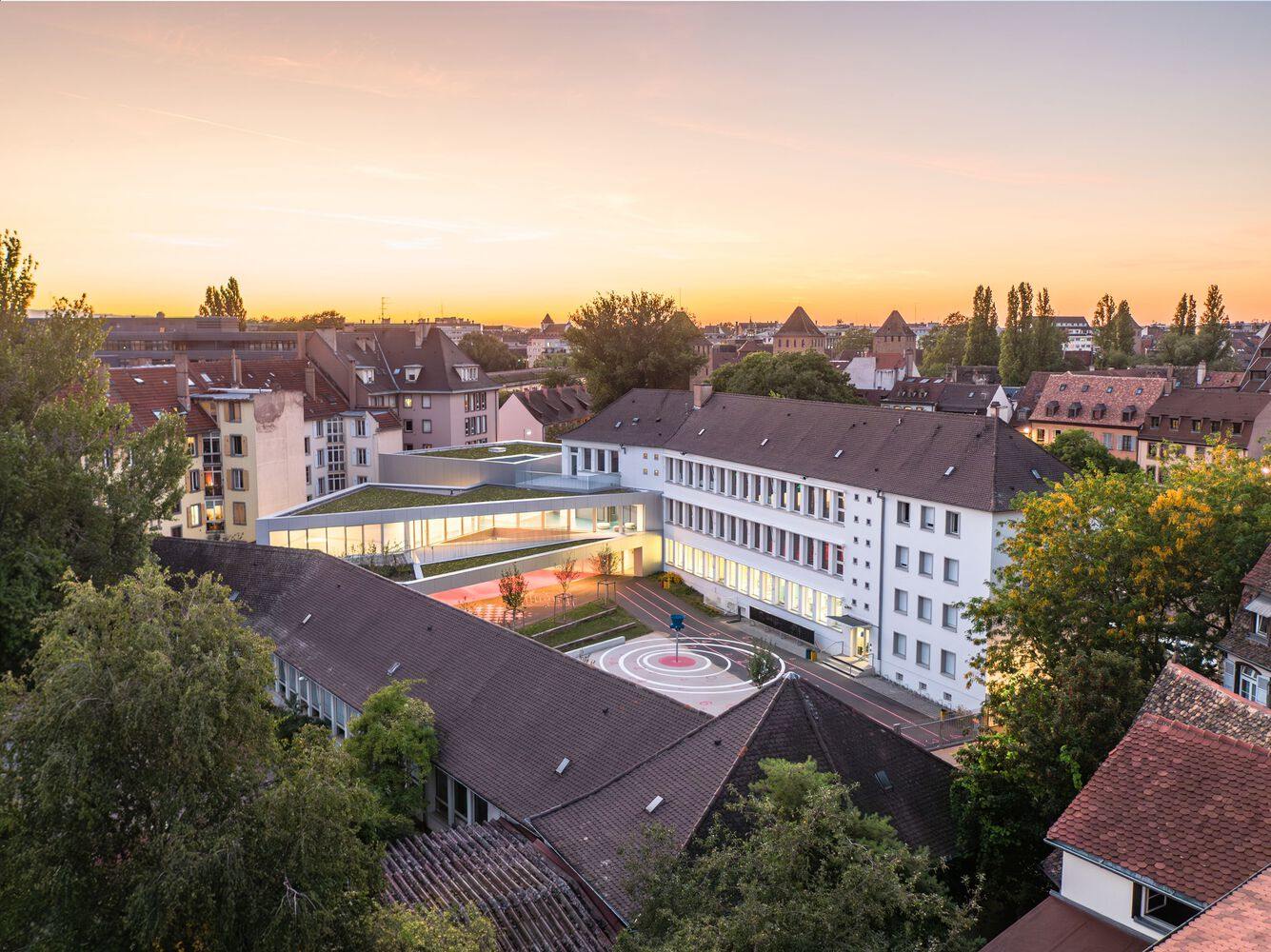 The expansion project of Finkville School is located in a diverse urban environment with strong cultural and architectural features. The school was built in the 1960s and is located adjacent to several important historical sites, such as the ancient stone walls surrounding the playground, the famous Ponts Couverts bridge nearby, and the River Il.