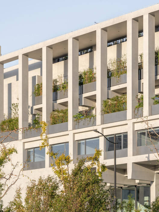 东立面的三层至五层建筑立面也通过立柱与后退的界面,使得教室和办公室获得了充满绿植和自然光照的室外阳台,让这些房间的窗户避免直面嘈杂的城市主干道。建筑师通过东侧界面的处理,即维护了建筑内部功能的属性要求,又实现了研究中心的城市性与开放性,以合理的方式让建筑的城市界面和人们的日常生活有了交集。