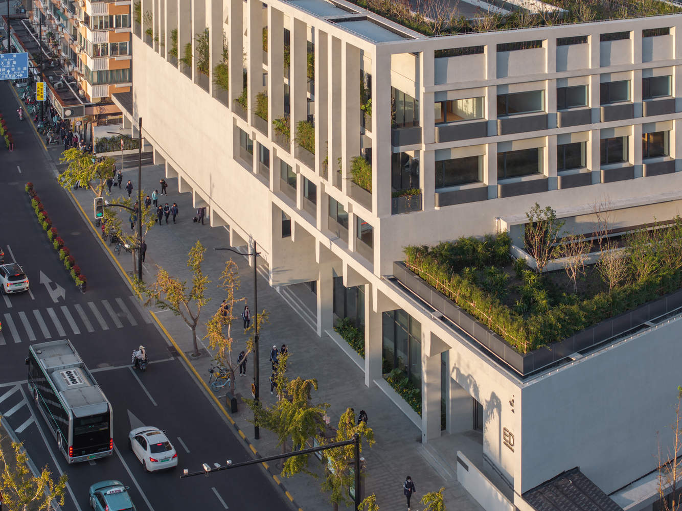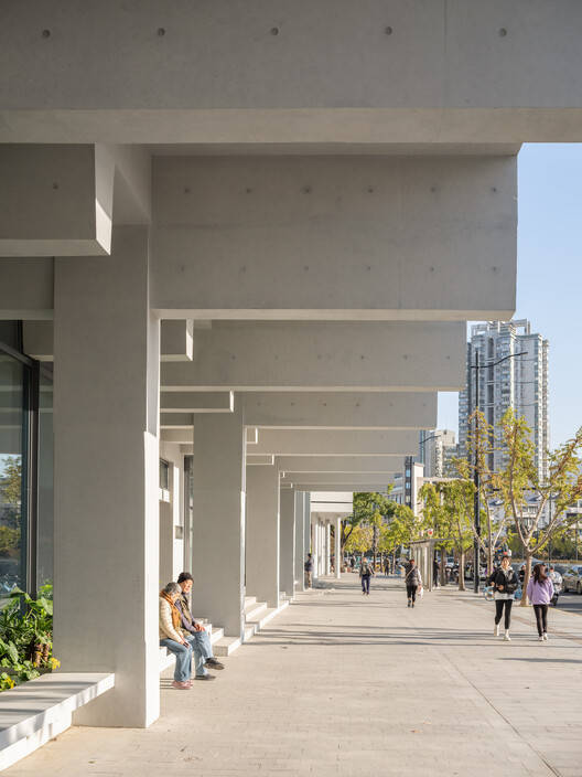 Siping Road is an important urban transportation artery that runs from Yangpu District to Hongkou District. The research center base is located at the intersection of Siping Road and Dalian Road, which is affected by the underpass. The motor vehicle lane and non motor vehicle lane are all offset towards the west, resulting in significant compression of the sidewalk. After the launch of the research center project, the original New Medical Union Outpatient Department building was demolished, and this interface became the most important facade facing the city of the research center. The architect retreated the first floor interface by 5 meters, and the second floor and above buildings were cantilevered outward, forming a city sized corridor space at the Siping Road interface, giving pedestrians a sense of place to stay. The eaves corridor extended northward until the entrance of Yangpu Senior High School, and the preserved cedar forest integrated into the urban landscape through the lowered wall.