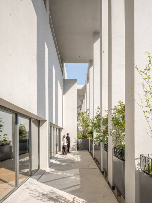The three to five story building facades on the east side also provide outdoor balconies filled with greenery and natural light for classrooms and offices through columns and setback interfaces, allowing the windows of these rooms to avoid facing the noisy city main roads. The architect maintained the functional requirements of the interior of the building and achieved the urban and open nature of the research center through the treatment of the east interface, which allowed the urban interface of the building to intersect with people's daily lives in a reasonable way.