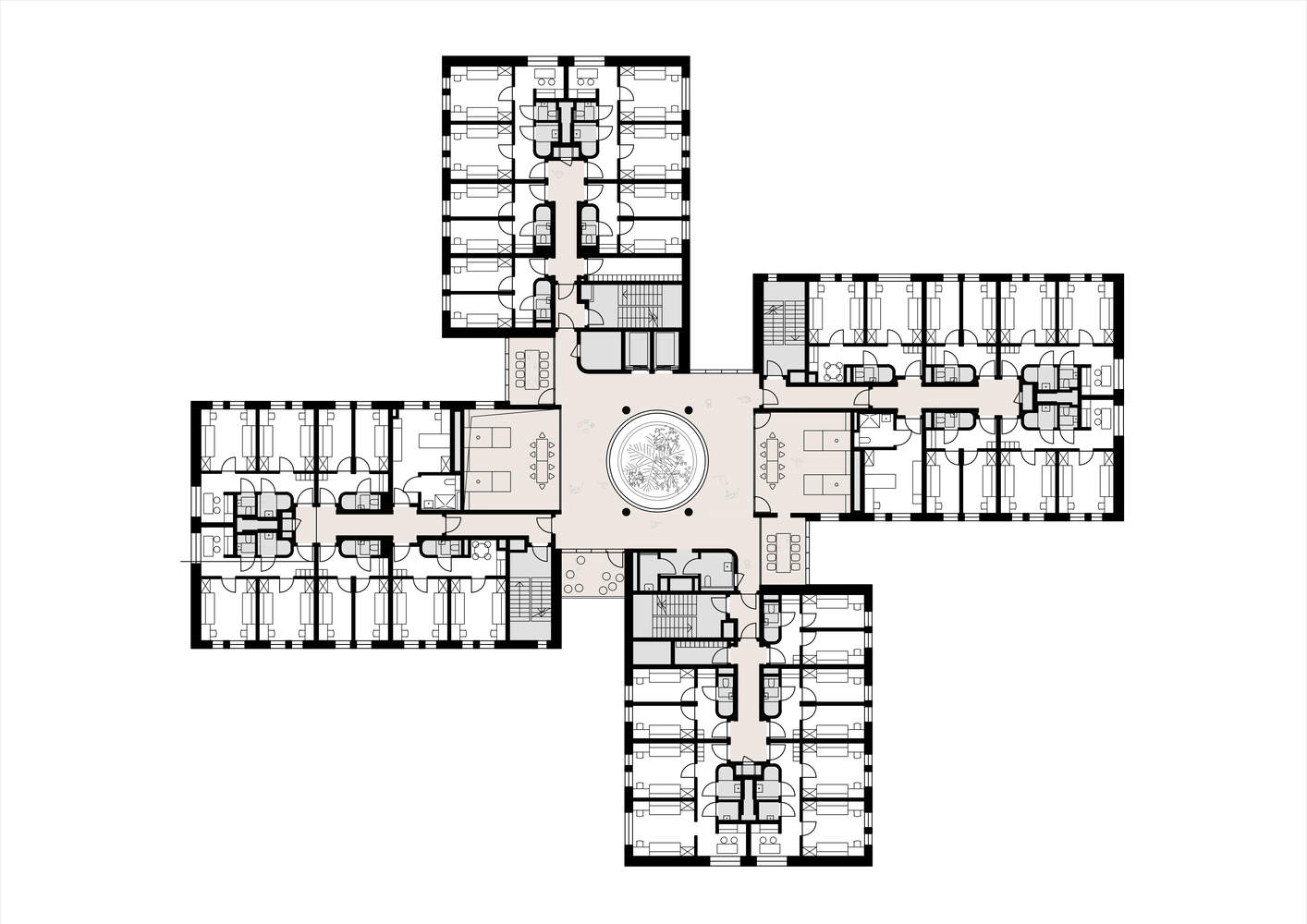 在由华沙建筑事务所 Projekt Praga 设计的获奖方案中,该宿舍打破了传统的学生宿舍模式,采用四翼围合的结构,并以“倒置”庭院取代传统的走廊式布局。建筑灵感来源于风车般的平面布局,四个独立的翼楼各自形成紧密联系的小型居住社区,而建筑核心则是一个玻璃中庭,为内部空间带来自然光线,同时成为学生交流的中心场所。