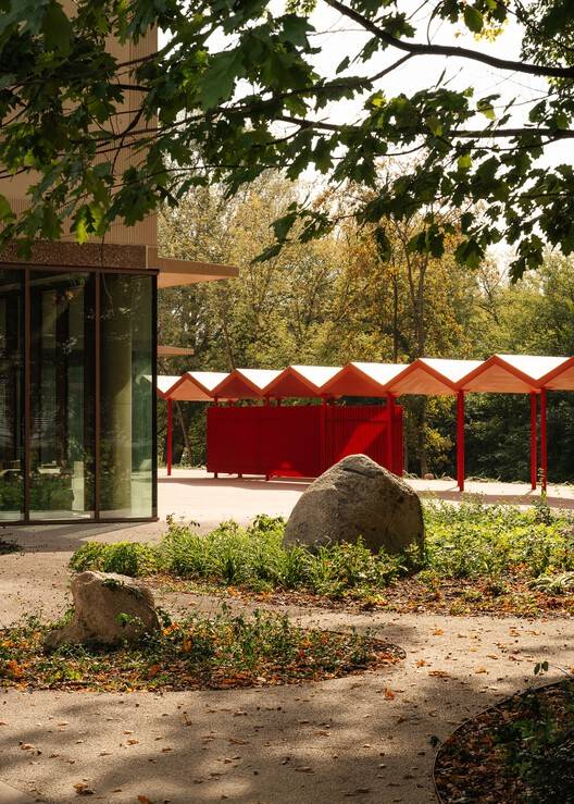 建筑在节能方面亦表现出色,最大限度降低环境影响与运行成本。走廊区域设置大面积窗户,引入自然光,以减少人工照明需求;太阳能板与热回收系统优化能源使用,而外部百叶窗则有助于调节室内温度。景观设计尽可能保留现有植被,并采用透水铺装,使建筑与自然环境和谐共生。