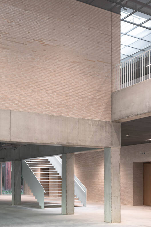 建筑设计包含五个独立体量。这些体量在地面与上层楼层中,与中央门厅在水平与垂直方向上无缝相连。这种布局促进了空间之间的连贯流动,提升了建筑内的可达性与互动性。体量的位置根据关键视线与建筑群期望的空间品质而定。水平门厅本身由面向公共广场、主入口与多个绿色庭院的透明立面所框定。庭院标志着向不同楼层现有建筑的过渡,并为较低楼层引入自然光线。水平门厅始终提供室外与其他建筑的视野,让用户自然地理解建筑群的布局。它围绕砖砌体量——“研讨厅”——进行组织,内部设有美食广场、礼堂、讲堂、项目空间、会议室以及一个独立的商业区域。垂直门厅将“研讨厅”与“学习塔”相连,后者内设教室、计算机房与技能实验室。宽敞舒适的楼梯与学习空间相结合,成为每层公共空间的延续。为鼓励使用楼梯以助力健康老龄化,电梯仅在奇数楼层停靠,要求用户上下一层楼梯。塔楼砖砌立面上的大型深窗,呈现出开洞的韵律感,并提供了多样化的宜人视野,可俯瞰市中心。最后,建筑宜人且易于抵达的绿色屋顶露台,强化了校区的绿色核心。