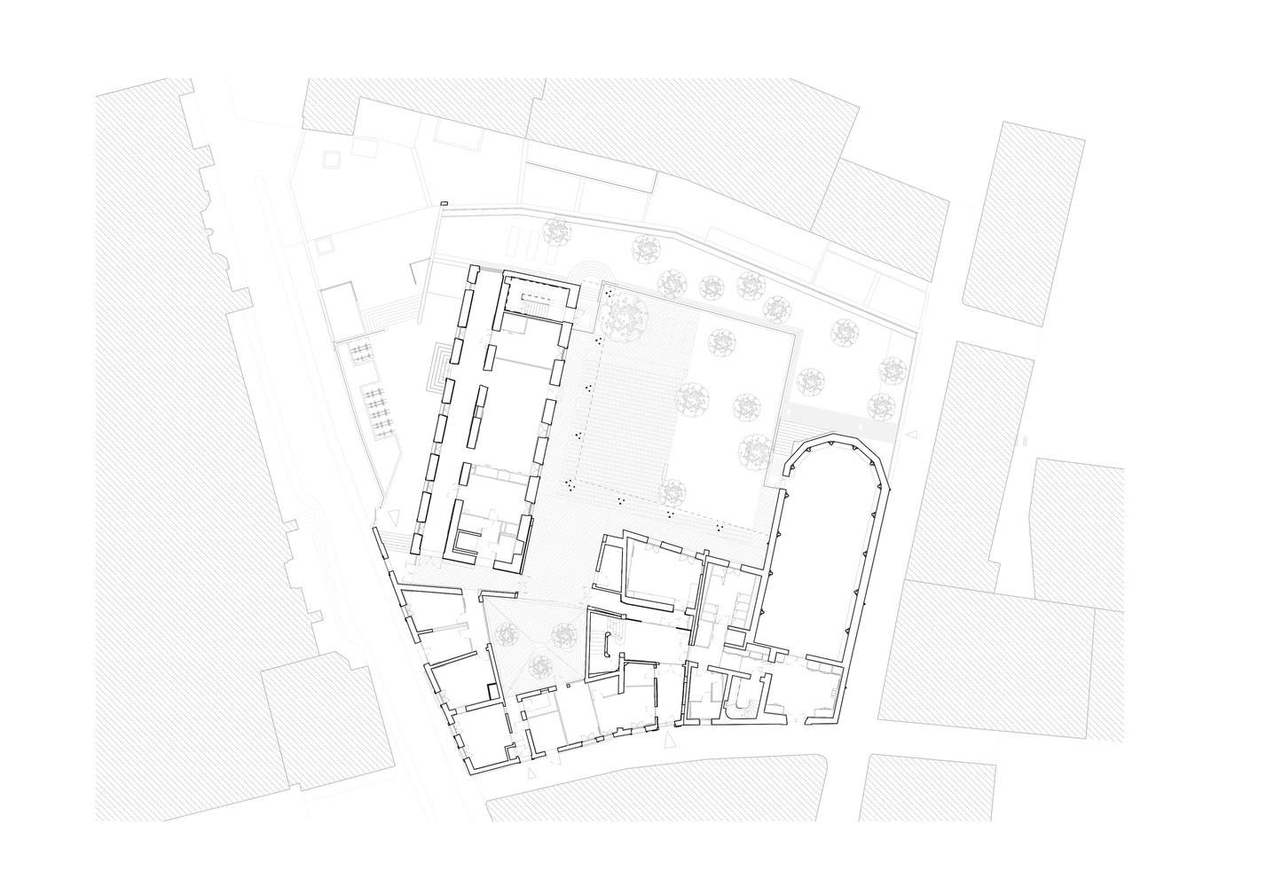 庭院成为小学的中心空间。从入口可直接进入,并通过一条宏伟的通道与操场相连。这一设计直接参考了乌尔苏拉会修道院的原始平面图,该平面图将大庭院(现为庭院)与花园相连,而花园如今已改造为操场。拆除 20 世纪建造的阻碍该区域的建筑,揭示了圣查尔斯之家和布里萨克酒店的历史立面。每面墙壁都通过其裸露的石砌表面讲述着故事。大楼梯的立面已恢复其原始功能,重新开放的历史开口重新确立了与这一重要入口点相关的实与空的节奏 —— 同时也提供了新的视角,可观赏大教堂的尖顶。
