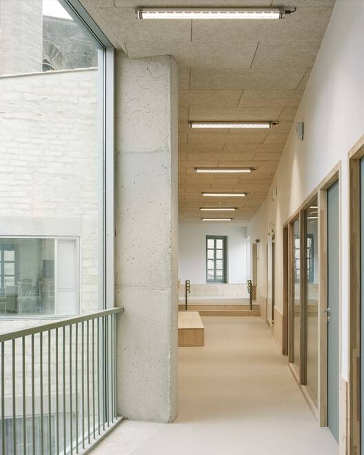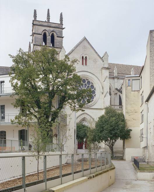 The courtyard has become the central space of the elementary school.. You can enter directly from the entrance and connect to the playground through a magnificent passage. This design directly referenced the original floor plan of the Ursula Monastery, which connected the large courtyard (now the courtyard) with the garden, which has now been transformed into a playground. Demolishing buildings constructed in the 20th century that obstructed the area revealed the historical facades of the Saint Charles House and the Brissac Hotel. Each wall tells a story through its exposed stone surface. The facade of the grand staircase has been restored to its original function, and the reopened historical opening has re established the rhythm of reality and emptiness associated with this important entrance point - while also providing a new perspective to admire the spire of the cathedral.
