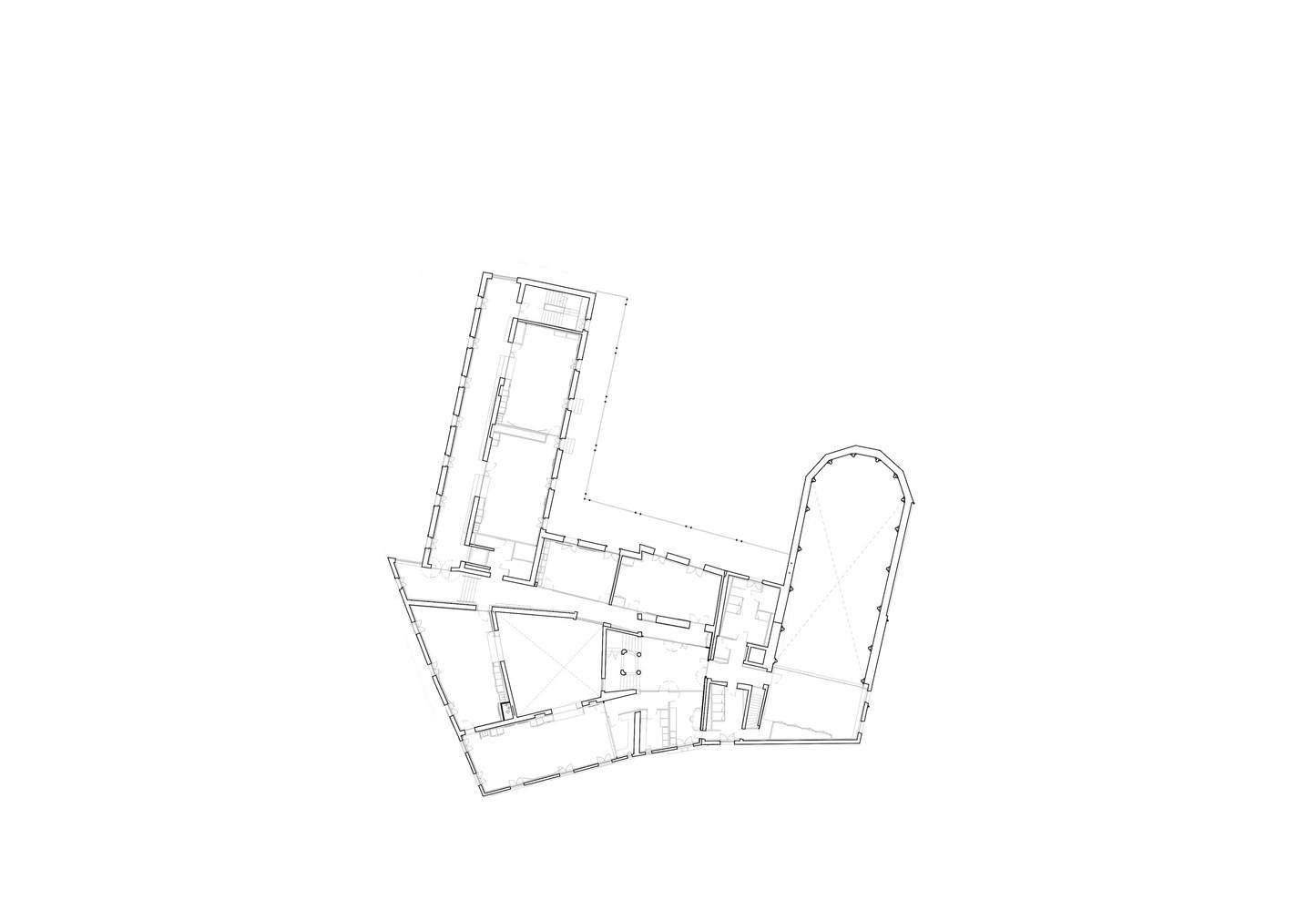 当代的添加物存在但不显眼,避免了对历史体量的干扰。供暖和通风系统被集成到地板中,而声学和照明则通过独立的金属框架和拉伸织物处理,为每个开间增添了节奏。结果是一个强烈而适度的干预。