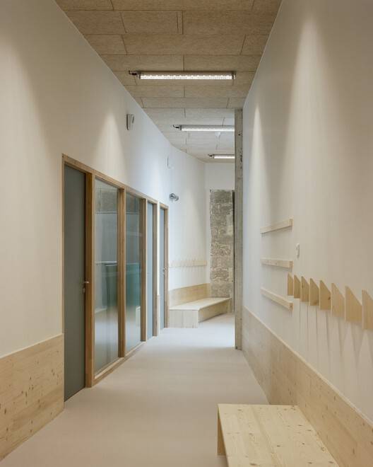 内部空间以克制和简洁的方式处理。石墙被剥去积累的层次,露出精细砌筑的砖石,反映了以前的建筑功能。混凝土因其能够向流通区域开放学习空间而被选中。经过原始处理和喷砂处理后,它现在构成了空间身份的一部分。其他干预措施则青睐各种形式的木材:从实心或穿孔的墙板到纤维天花板,以及定制的家具安装,以优化入口并隐藏技术管道。所有地板都已完全拆除,仅保留主梁暴露在外。采用了一种技术安装新的地板系统,该技术保留了可见的下方横梁,并完成了粘土珠抹灰,最后以适当的声学地板收尾。这些选择是为了提供符合当代小学期望的最佳学习条件。