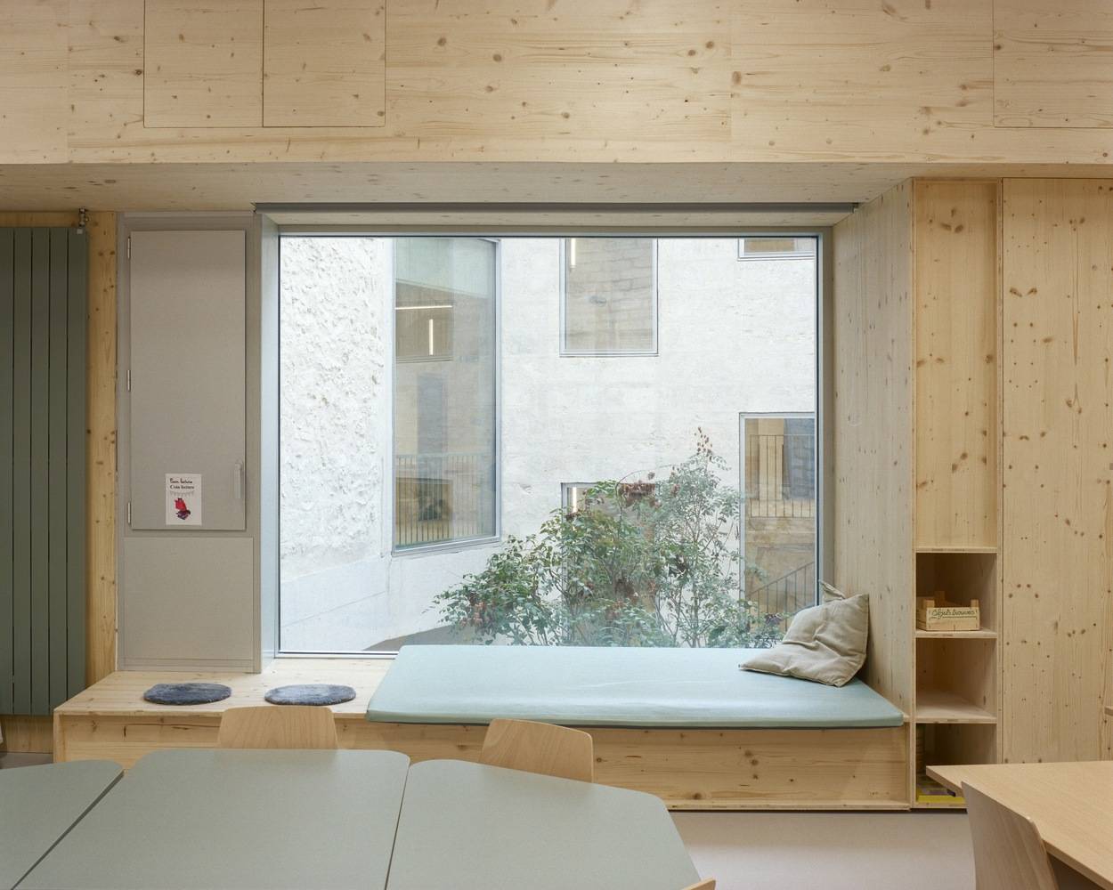 Restoring the original transparency helps to reduce density and bring natural light into the center of the building, symbolizing a courtyard that reveals the original layout of the H ô tel de Brissac courtyard. After demolishing the middle floors added in the 1990s, the church also restored its original volume. This complex and demanding restoration process balances secular considerations and memory preservation, creating a brand new and unique place where children's well-being is prioritized.