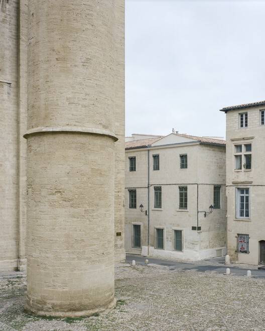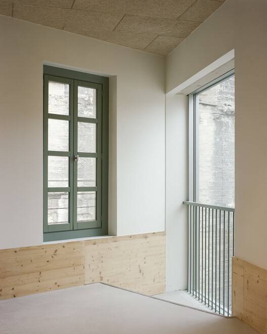 The third gap is located at the end of the western wing's gable, which frames the gallery and directs the view to the National School of Dramatic Arts of Montpellier, which was once connected to the current building. The demolition work in the 1990s erased the historical urban structure - now symbolized only by these large openings. The large aluminum framed windows provide ample natural light for the entire school, while offering a new perspective on Montpellier's historic city center.
