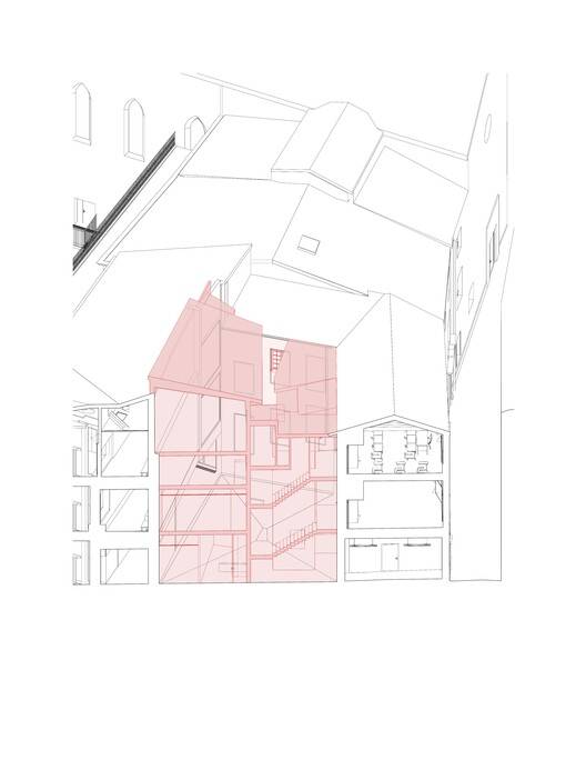 Sequentialization through gaps - three oversized vertical openings separate the building, revealing key historical nodes. The first opening can be seen from the new entrance of the school, marking the sale of the Ursuline Abbey after the French Revolution in 1792 and the simultaneous addition of the 'West Wing'. The second opening is visible in the current courtyard, highlighting the connection between the Brissac Hotel and the elevated West Wing before 1857, which closed off the monastery's large courtyard.