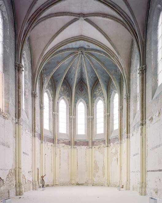教堂是该场地历史的重要标志。它由建筑师努尔马·波尔热(Nulma Polge)于 1857 年以新哥特式风格建造,在 1990 年代进行了大规模改造,增加了混凝土夹层,将建筑分为两个表演空间供音乐学院使用。修复的主要目标是通过拆除这一中间楼层来恢复原始体积。拆除后,整个空间用石灰涂层的无纺布统一处理,以统一破损的墙壁,而不损坏装饰 —— 尽管许多元素都是年代不明的仿制品。所有彩色玻璃窗都经过精心拆除,采用传统方法修复,并重新安装。