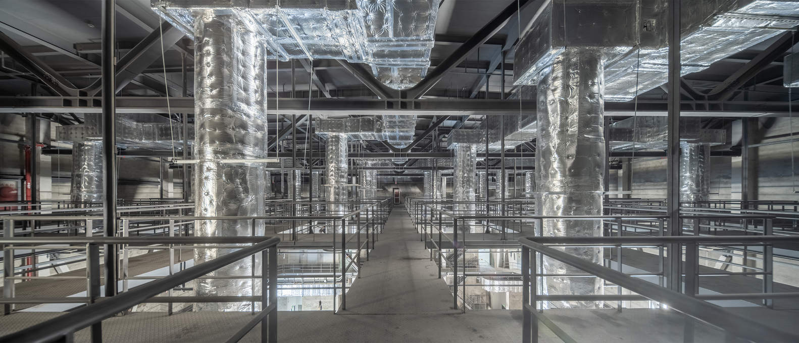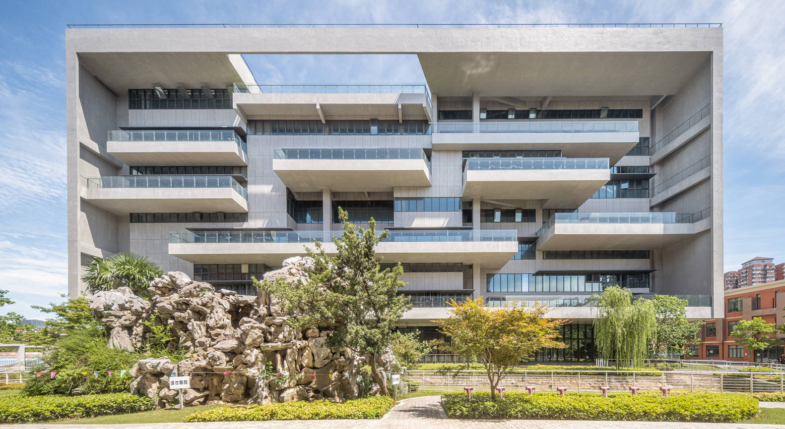 The suspended building on the upper part of the Film Academy is supported by six core tubes and achieves flexible large space through a steel truss support system, creating a unique spatial effect inside the building. The horizontally stretched U-shaped glass volume is suspended above the green trees and red walls of the existing campus, creating a dialogue with the surrounding environment using a new architectural vocabulary.