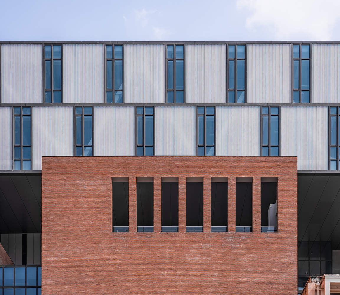 The architectural form of the Film Academy reflects the logical relationship between internal functions and space. The solid exterior wall of the building, which serves as the base, is constructed with red clear water bricks, and the warm colors, materials, and building scale correspond to the old campus; The entrance hall and communication space adopt a tall door and window system, introducing the external landscape into the interior, forming a campus landscape that integrates indoor and outdoor spaces.