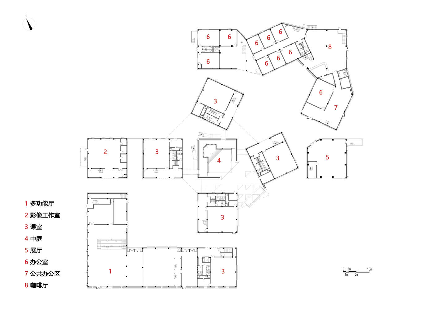 在不破坏原有墙面和屋面材料的基础上,通过干挂砖幕墙和GRC幕墙,为建筑穿上一层红白交叠的“新衣”,中央白色盒子顶部局部增设U玻,成为建筑群落的中心和制高点,使得混乱的元白楼群落成为一个具有向心感的整体。外围盒子为红砖幕墙,点缀白色格栅,呼应校园周边的红砖建筑。