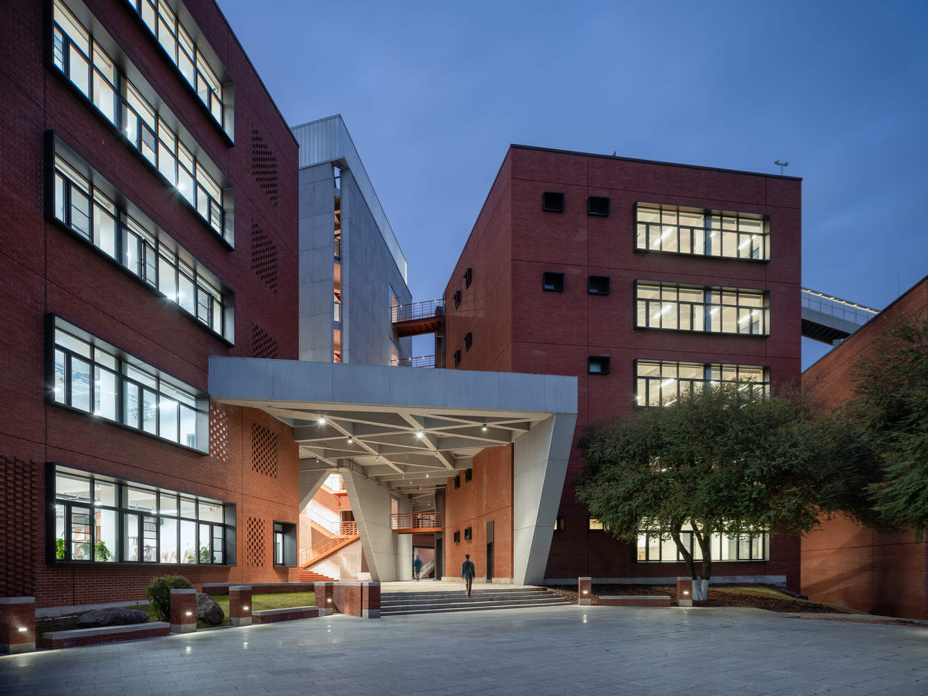 “皮外皮”的改造策略与文化基因的延续: 该项目巧妙地运用了“皮外皮”的改造策略,在不破坏原有建筑结构的前提下,通过干挂砖幕墙和GRC幕墙为建筑赋予了新的外观。这种手法不仅有效地控制了成本和工期,更重要的是,它赋予了建筑新的生命力。红白交叠的色彩组合,呼应了校园周边的建筑风格,使得改造后的元白楼与校园环境融为一体。此外,设计还强化了形式母题,例如三角形的入口雨棚和天窗,以及红砖的重复使用,使得建筑的文化基因得以延续,并在视觉上增强了整体的凝聚力。这种策略体现了设计者对旧建筑的尊重和对校园文化的传承。
