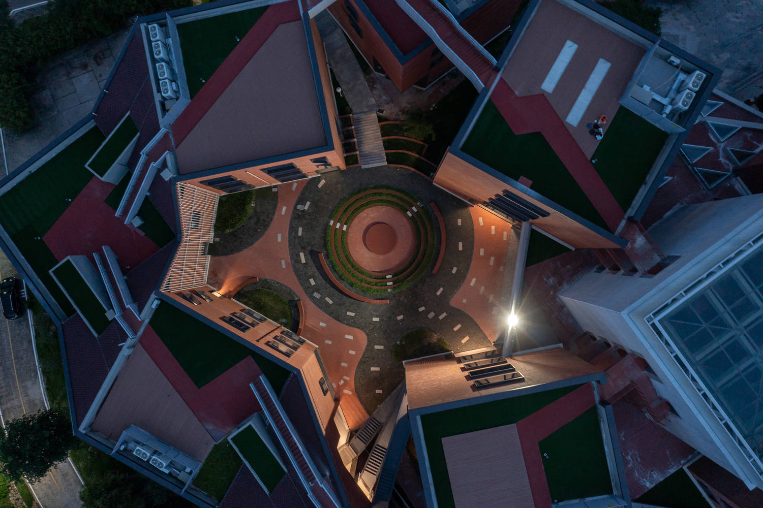 两个院落原先为消极的负空间,景观设计将其整理为“一方一圆”两个院落。方院围绕保留的凤凰木形成红砖座椅;圆院围绕原有下沉地势设置圆形舞台,形成核心空间。织补原有路径,形成多方向入口路径,将师生引入院落,创造整个校园的活力场所。如今,方院和圆院是学校举办各种创意市集、文化演出的场所。