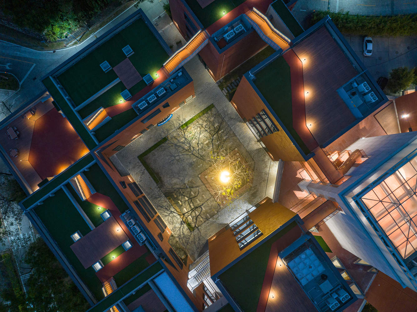 . There were originally some outdoor corridors and stairs between the boxes in Yuanbai Building, but they could not penetrate all the boxes, resulting in a broken path and different charm. During the renovation process, following the charm of Qi Gong's calligraphy, the original "broken strokes" were connected through the addition of corridors, running tracks, and other methods, forming a seamless three-dimensional walking path that connects the roof and ground. The location of Yuanbai Building is backed by mountains and facing water, blending the charm of the site with the theme of "brush and ink swimming dragon", providing opportunities to experience nature from different perspectives. The roof corridor is wrapped in perforated aluminum panels and designed with night lighting, resembling a dragon swimming. Cover the existing equipment and shafts on the roof with grilles, and set up lawns or wooden enlarged platforms in some areas to create a space and trigger different usage behaviors.