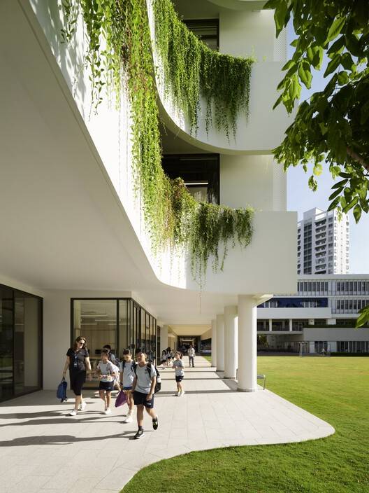 These two buildings are cleverly located on both sides of a spacious sports field and green space. Their architectural styles complement each other, using bright colors and undulating curves that harmoniously interact with the grid structure. Inspired by the terraced fields of Sa Pa in Vietnam, the planting boxes highlight the curves of the architecture and are paired with local plants, adding visual interest while breaking the monotony of the building. In the wind and rain, plants with lush greenery appear more vivid. The bamboo elements inside the hall carry a commitment to local aesthetics and sustainability, while capturing natural light. The various floors of the building are like branches extending to the outside garden balcony, ultimately connecting with the surrounding river, forming a seamless connection between the educational space and nature.
