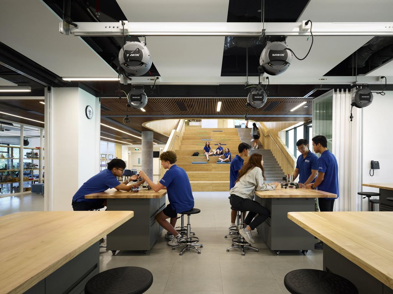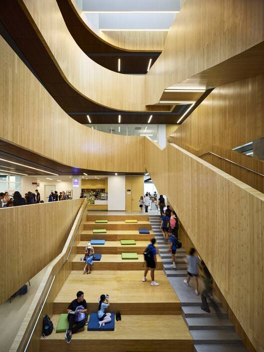 STEAM 设计设有五个科学实验室、两个艺术教室、独立的艺术工作室、一个 3D 艺术与版画制作室以及一个室内/室外艺术画廊。STEAM 设计中心为高中生提供了在一个开放、灵活、跨学科的学习环境中,探索创造力、点燃激情并发展未来所需技能的机会。中学为 6 至 8 年级学生设计,注重学生的情感、创造力和身体成长。天窗大厅鼓励合作与归属感。明亮的开放空间鼓励动手学习,促进学生的实验精神。空间包括一个 220 平方米的黑匣子剧场、舞蹈室、教室、科学实验室、休息室和创客空间。图书馆作为社区的研究与探索中心,体育馆则提供了丰富的身体活动、团队运动和社区活动的机会。
