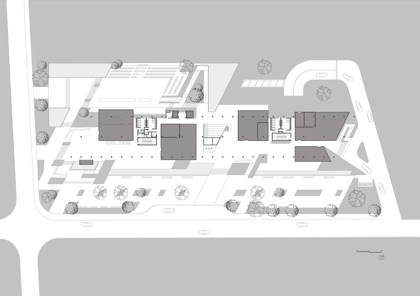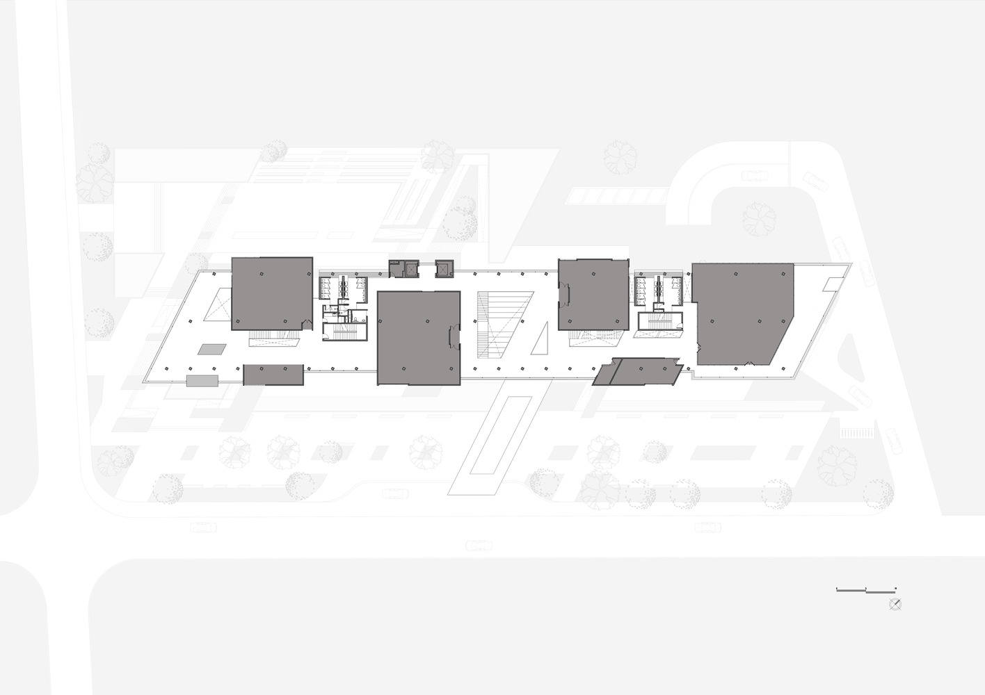 一楼设有商业功能和一个小型博物馆。二楼和三楼分别是共享办公空间和教室,而三楼还设有私人办公空间、功能厅和媒体室。室内和室外露天剧场为非正式聚会提供了场所。屋顶下方是露台,提供座位区域,可欣赏岛屿周围的景色。封闭的砖砌体量与所有位于同一屋顶下的露天内部空间之间的互动,创造了一种独特的空间体验,通过视觉和听觉联系,动态地吸引建筑使用者。