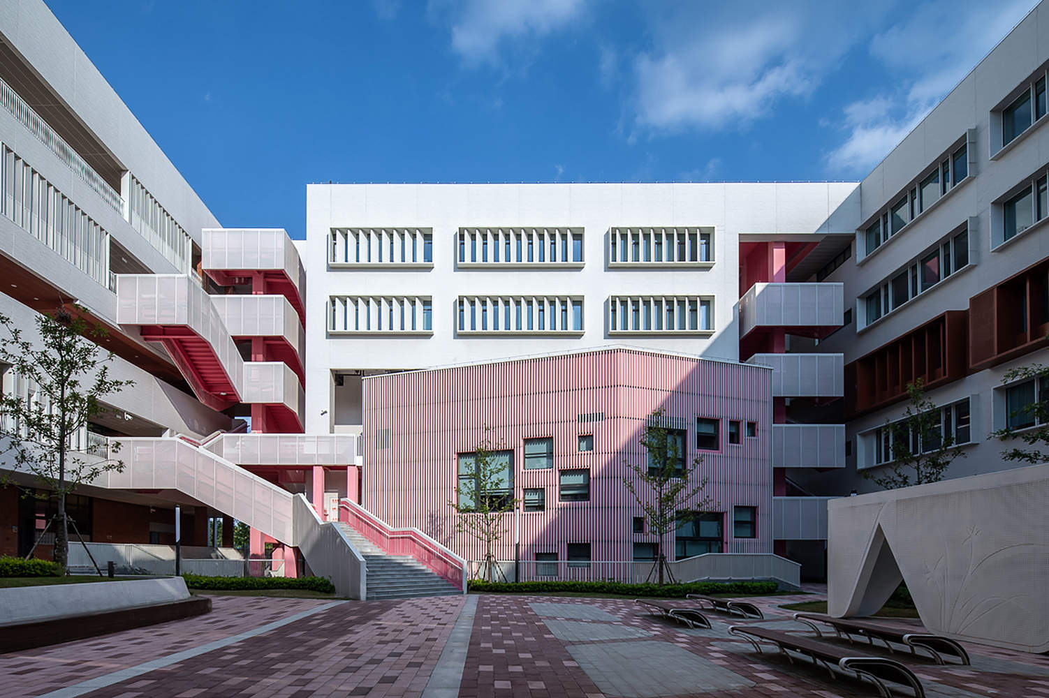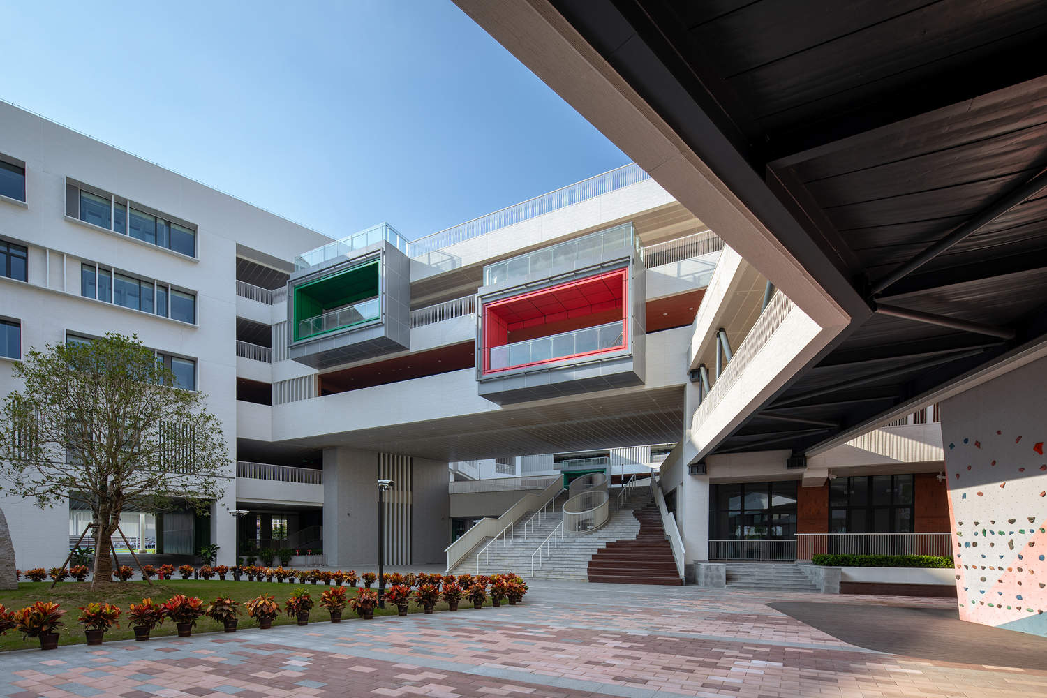 空间体验的创新与人性化:项目在空间体验方面展现了极高的设计水准。通过架空层、楼梯、坡道、屋面花园等元素的巧妙运用,营造出一种连续、开放的社交空间体系,为孩子们提供了丰富多样的活动场所。设计者并未拘泥于传统的封闭式走廊,而是采用飘窗、调整窗户尺寸等手法,将校园景观融入教学空间,使窗框成为“相框”,校园化身为“景区”。这种设计不仅改善了采光和通风,更重要的是,它营造出一种与自然亲近、富有诗意的学习环境,极大地提升了学生的空间体验和学习乐趣。