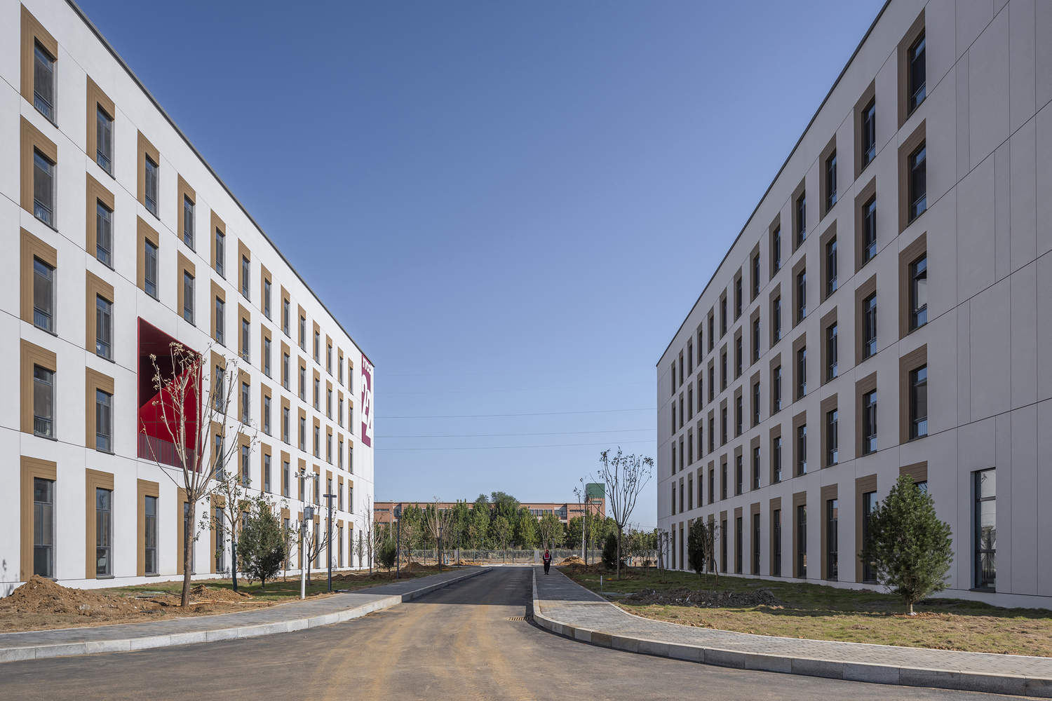 The four dormitory buildings on the southwest side of the campus, along with the existing library and gymnasium, together form the 'vibrant neighborhood'. The two dormitory buildings on the north side of the campus, along with the cafeteria and the existing dormitory, together form the 'Campus Farm Block'. The two dormitories on the northeast side of the campus, along with five teaching, training, and office buildings, a first level equestrian arena, and an existing teaching building, form the "Campus Square Block". The two teaching buildings on the southeast side of the campus, together with the existing teaching building, form the "tree lined avenue block" and become an important spatial node connecting Phase 2 and Phase 1. Each block has a core public space and diverse functions, breaking the single goal functional zoning and promoting communication and collaboration between different colleges and majors. The library, teaching building, gymnasium, equestrian arena, and campus farm will jointly constitute an important carrier of university life and education.