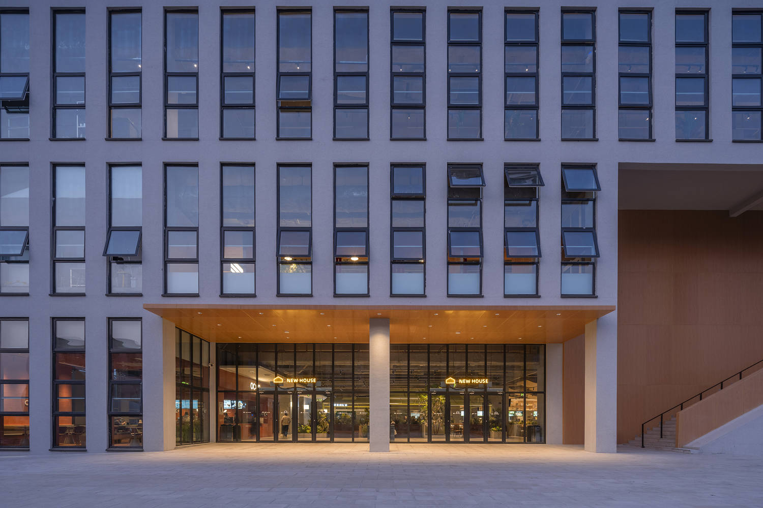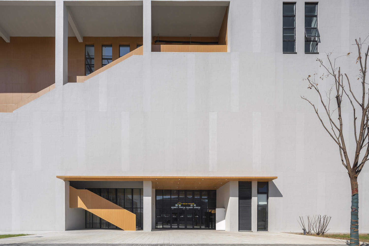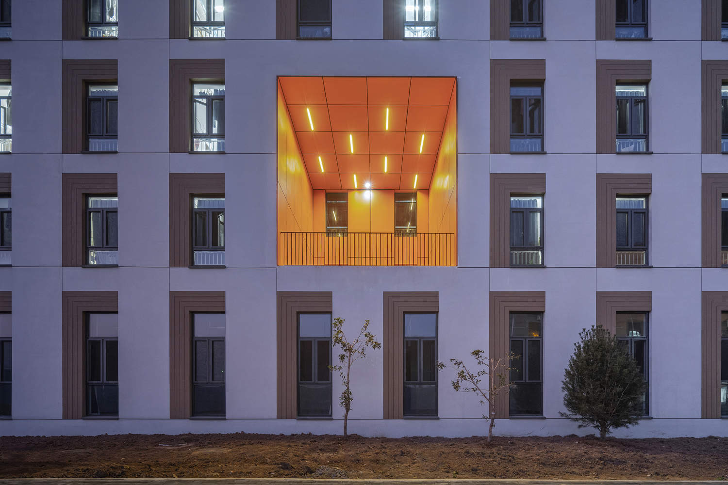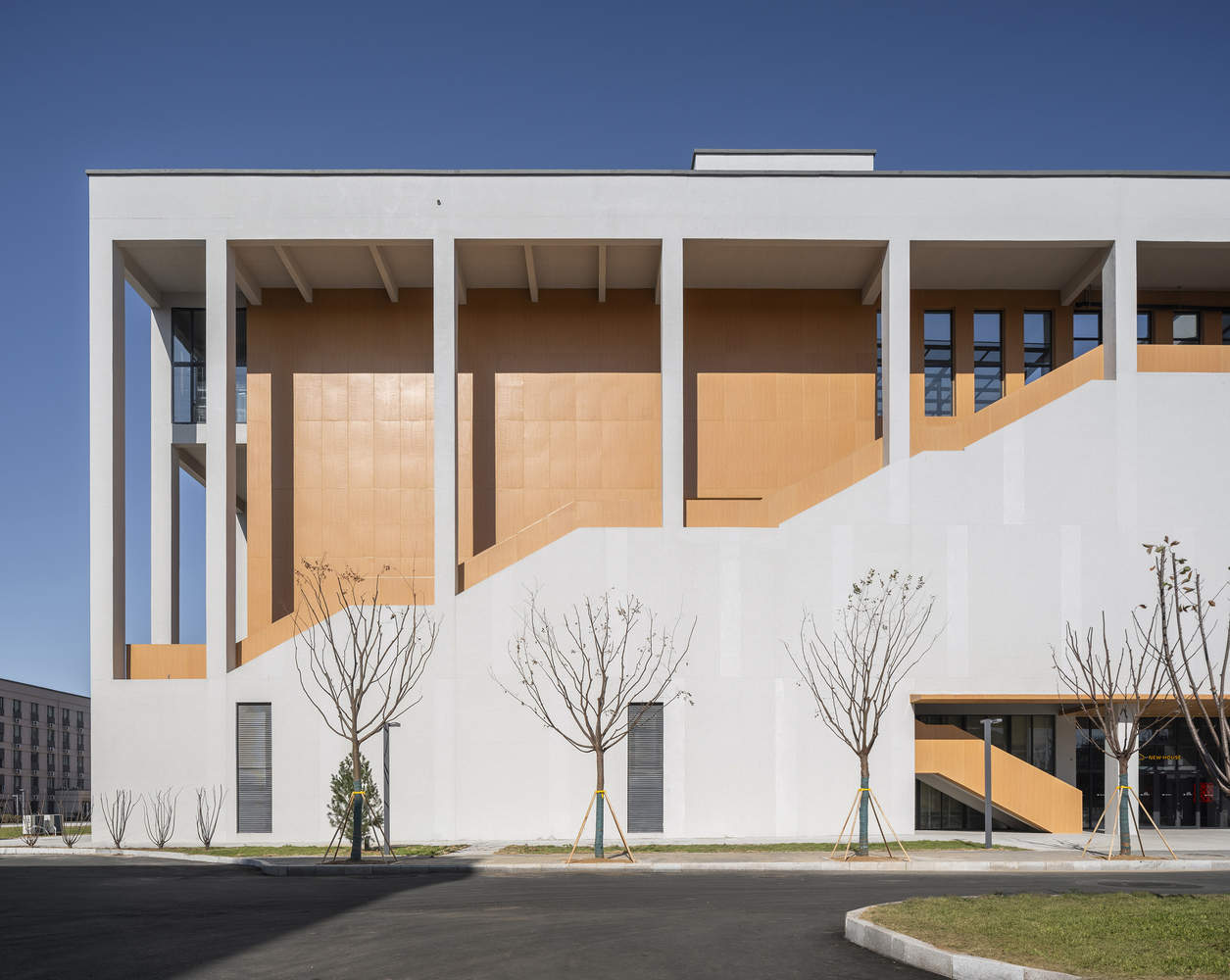 The newly designed cafeteria is located adjacent to the north gate of the campus, with 4 floors above ground and 1 floor underground, with an above ground building area of approximately 14100 square meters.. A continuous set of stairs is embedded in the south facade and extends to the east facade, connecting the first to fourth floors together. This space has become an embedded part of the campus open communication space into the cafeteria cube. This space is not only used as a staircase, but is composed of a set of different prototypes from urban public spaces, including a corridor, a small square on the second floor, an inner courtyard on the third floor, and a rooftop garden on the fourth floor. Therefore, this cube shaped cafeteria consists of two parts: an open communication space and a closed functional space. The enclosed functional space provides breakfast, lunch, and dinner services for thousands of students throughout the school. Open communication spaces provide important space for the formation of campus community life. This diverse set of spaces includes indoor space, outdoor space, and semi outdoor space, which are connected together to form an outward oriented living space in the city. At different times of the day, this place will be fully utilized to host open lectures, flea markets, club activities, birthday parties, course exhibitions, project promotions, and even dances and outdoor movies. The function of the cafeteria goes beyond the basic attribute of having three meals a day and has become a campus life generator that stimulates public interaction and promotes face-to-face communication. In architectural language, the overall structure of a building presents the materiality of space through the cutting of space and the dissection of specific parts. The volume covered by the handmade exterior wall paint is cut open, and the cut inner surface is covered with aluminum plates, presenting a smooth and material space. The function here is public communication.