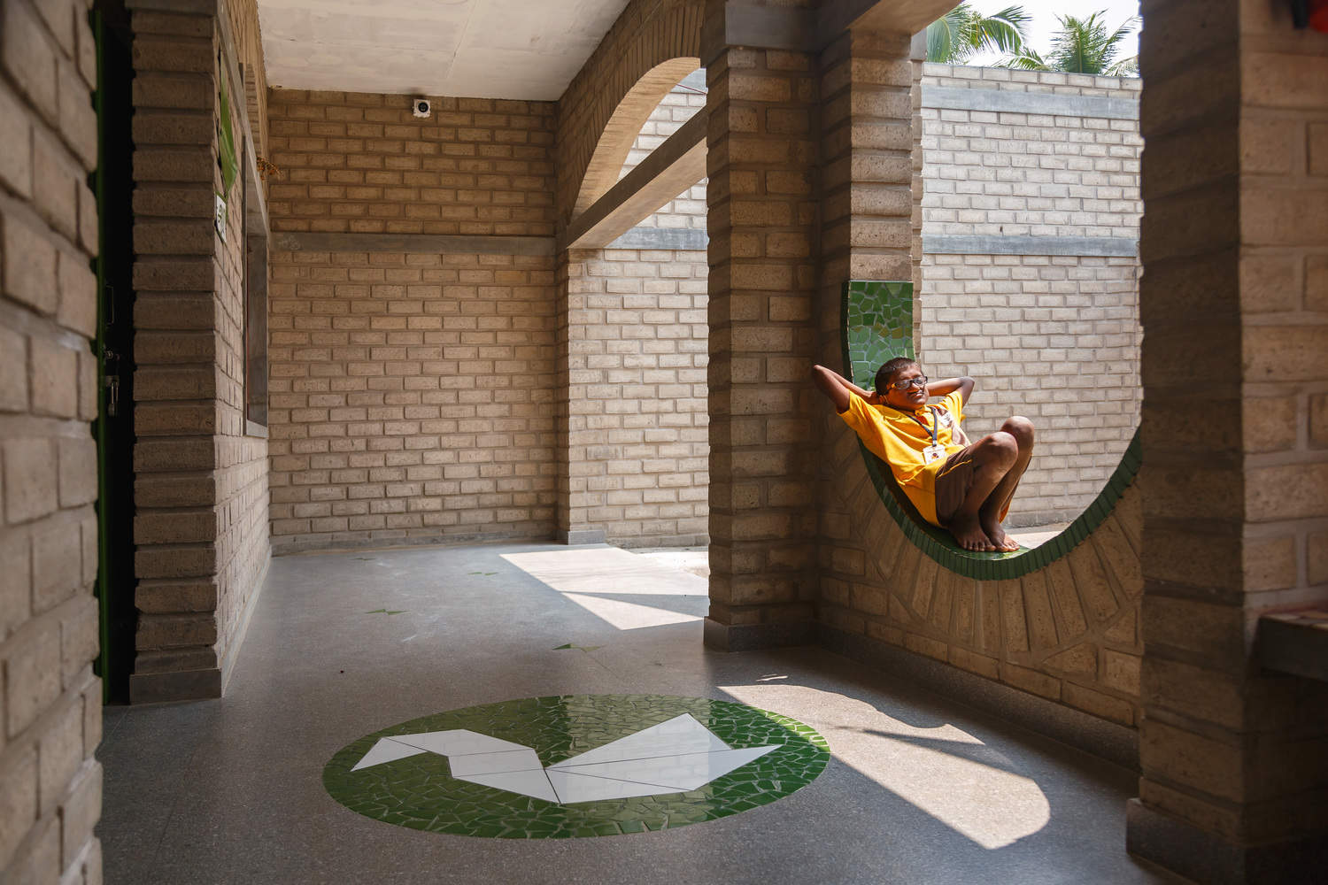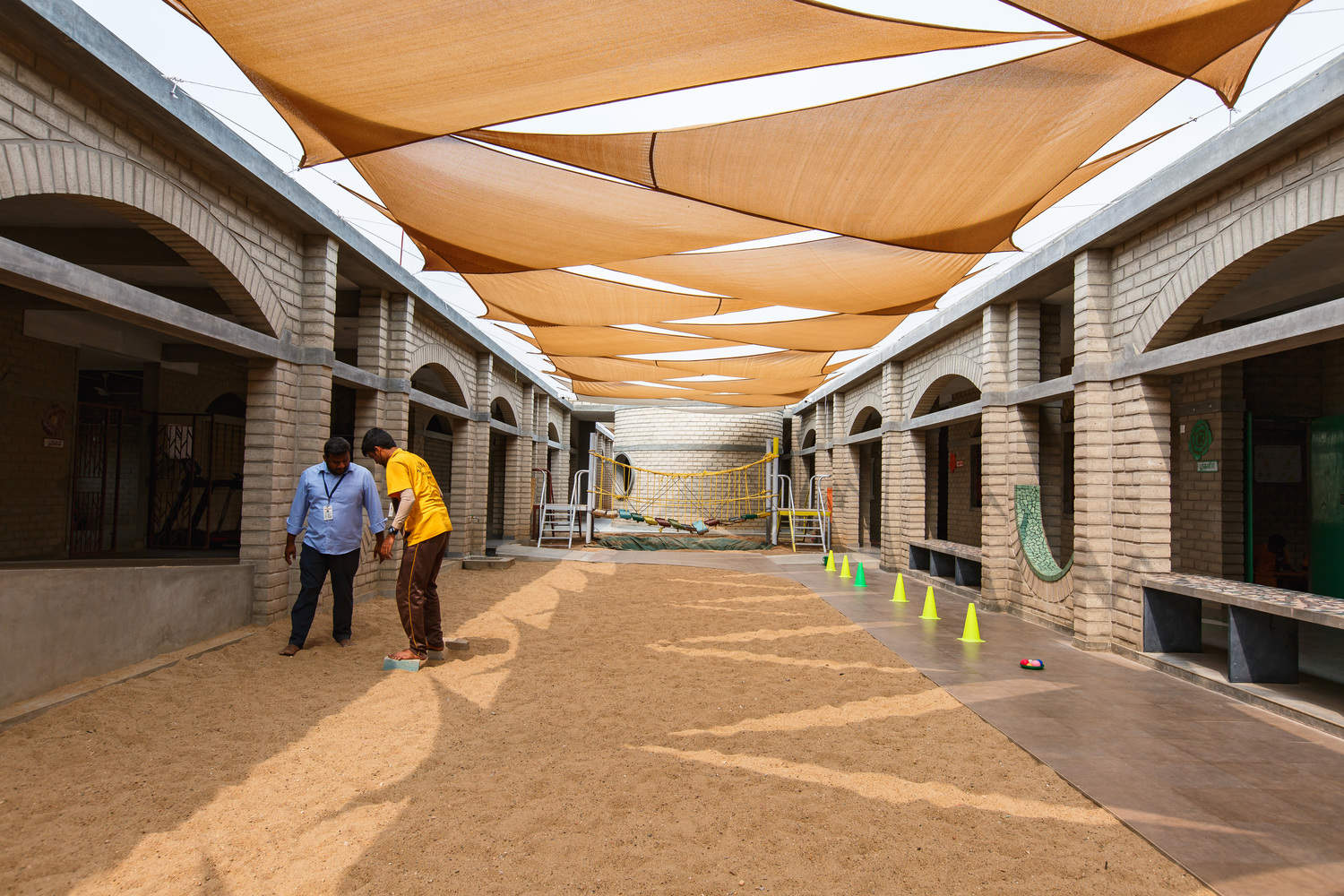 可持续性与气候适应:该项目在可持续性方面也表现出色。建筑师充分利用了南北立面,并通过遮阳设计减少了直接的太阳热增益,适应了蒂鲁普尔炎热的气候。材料的选择也考虑了当地的土壤条件和抗震要求,就地取材,利用石块、卵石和手工土坯砖,不仅降低了成本,也营造了自然的视觉体验。此外,张拉膜遮阳篷的运用,为庭院提供了舒适的开放空间。总而言之,该项目在满足特殊教育需求的同时,也兼顾了环境友好和可持续发展,体现了建筑设计的社会责任感。