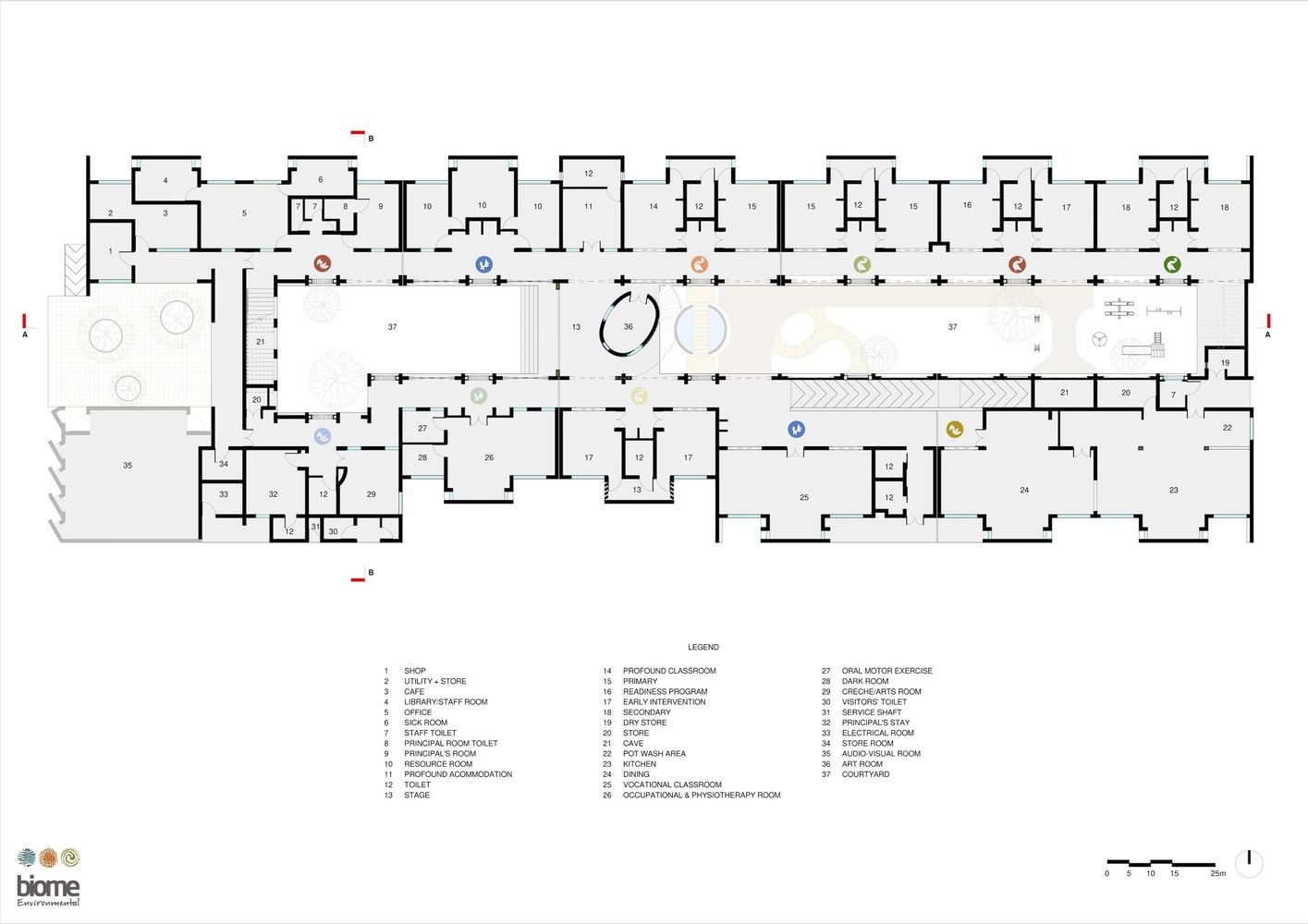 来自建筑师。Sai Kirupa 特殊学校专注于为患有自闭症谱系障碍(ASD)及其他学习障碍的儿童和青少年提供专业教育与职业培训。位于提鲁普尔的新校区旨在打造一个以学生全面发展为核心的中心,帮助他们培养独立能力与自理能力。校区设计经过精心考量,充分响应学生的多样化需求,营造出一个支持成长与发展的环境。由于学校由慈善信托基金运营,项目的实施高度依赖捐赠资金,因此设计方案必须具有灵活性,以便在资金到位的情况下分阶段逐步建设。