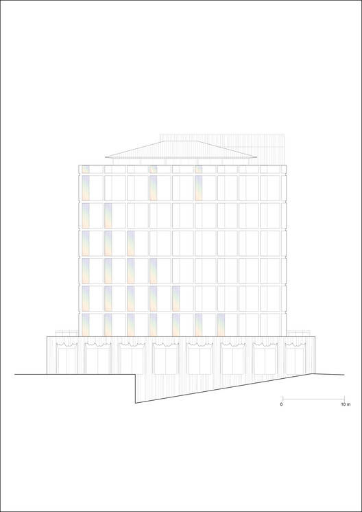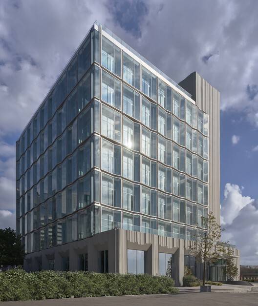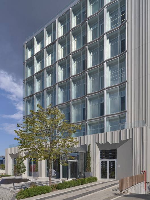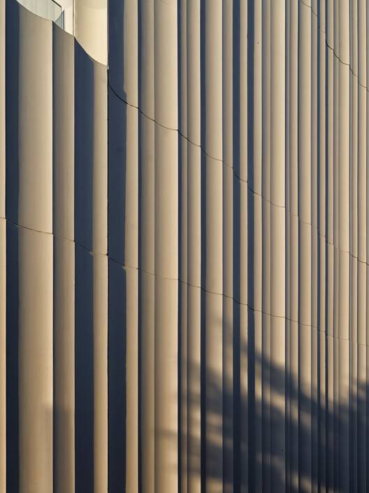可持续设计的实践:在可持续设计方面,该项目同样表现出色。为了减少建筑的碳足迹和运营成本,建筑师在建筑的西北和东北侧采用了双层表皮幕墙设计。该幕墙系统通过可开启的通风口和隔热层的设计,实现了对建筑热工性能的有效控制。在冬季,关闭通风口以保留热量;夏季则开启通风口促进空气流通,从而降低能源消耗。此外,双层幕墙还具备良好的隔音性能,提升了室内的舒适度。这种兼顾节能、环保和舒适度的设计理念,充分体现了建筑师对可持续发展和使用者体验的重视。