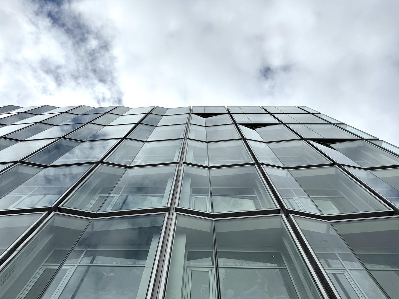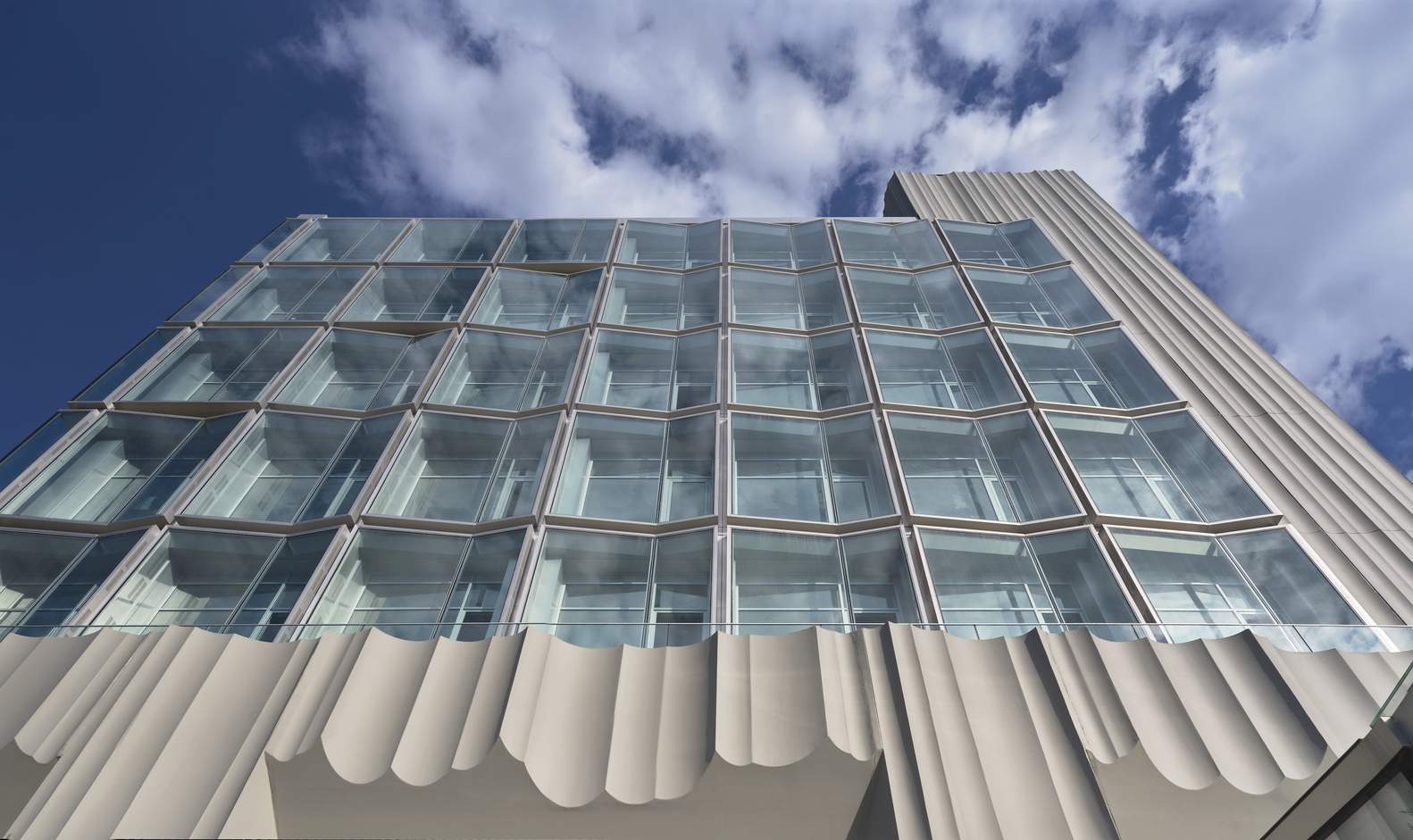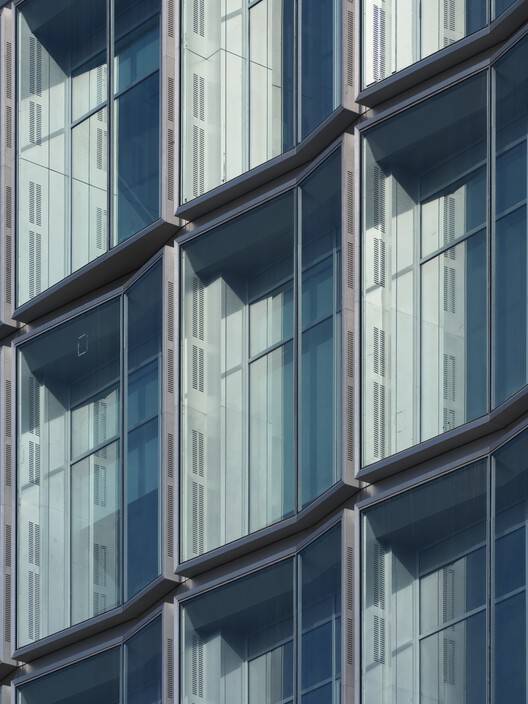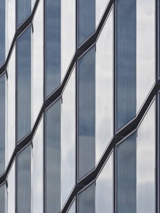 为最大限度降低建筑供暖与制冷所产生的碳足迹及运营成本,建筑西北面与东北面采用了双层表皮幕墙设计。凭借框架边缘设置的可开启通风口,该幕墙在夏冬两季均能有效提升建筑的热工效率。冬季时,这些通风口保持关闭状态,将加热后的空气留存在双层幕墙的中间腔体内,从而减少热量流失;而在温暖季节,通风口则开启以促进腔体内空气流通,使热空气排出,同时增加隔热层以抵御热量传入。此外,该系统还提升了幕墙的隔音性能,有效减少车辆噪音与风声等外部噪声干扰。