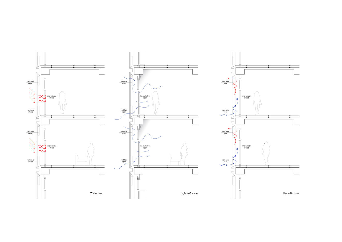 To minimize the carbon footprint and operating costs generated by building heating and cooling, a double-layer skin curtain wall design was adopted on the northwest and northeast sides of the building. With the openable ventilation openings set at the edge of the frame, this curtain wall can effectively improve the thermal efficiency of the building in both summer and winter seasons. In winter, these ventilation openings remain closed to retain the heated air in the middle chamber of the double-layer curtain wall, thereby reducing heat loss; In warm seasons, ventilation openings are opened to promote air circulation inside the chamber, allowing hot air to be expelled, while adding insulation layers to resist heat transfer. In addition, the system also improves the sound insulation performance of the curtain wall, effectively reducing external noise interference such as vehicle noise and wind noise.