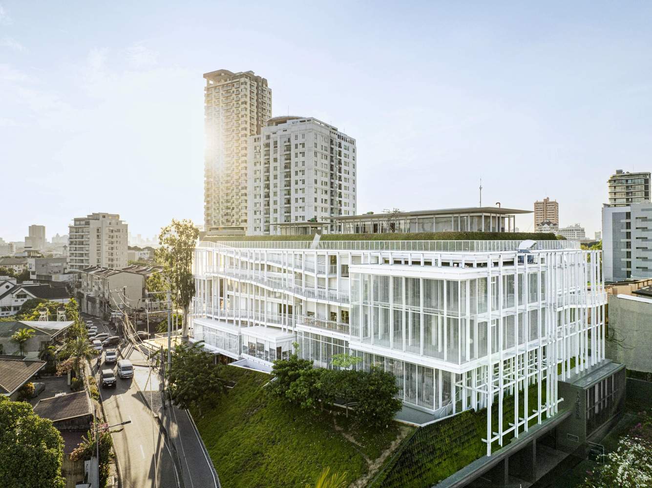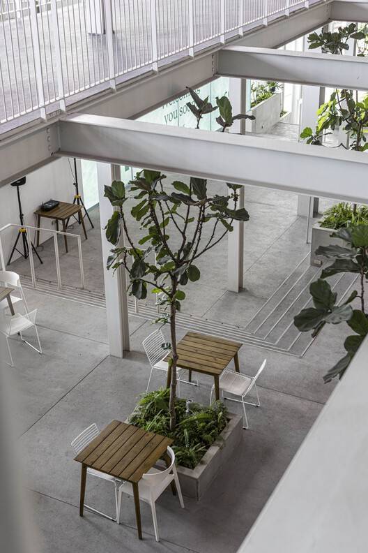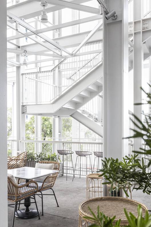 该设计采用层叠式地面层,将街道与四层高的中庭相连,营造出独特的露天体验,置身于漂浮的玻璃餐厅盒中。在适宜的天气条件下,电动百叶墙和卷帘可提供自然通风,而在季风期间,可操作的建筑围护结构则将空间封闭起来,使该项目成为适应性强、通风良好的建筑,能够响应其环境变化。