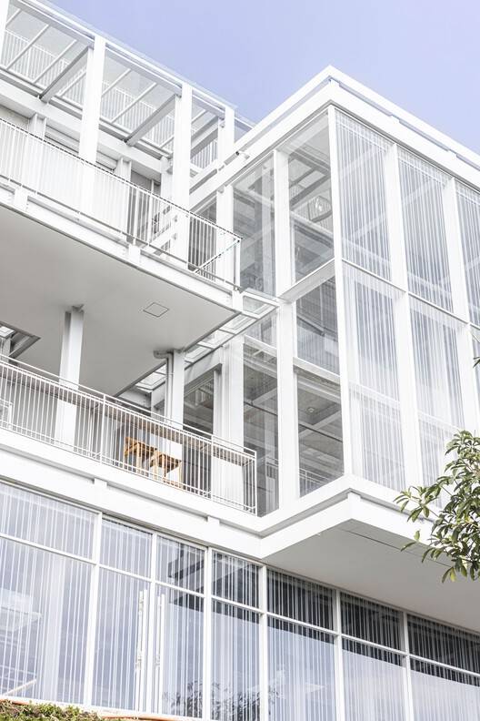 The design features a stacked ground level that connects the street to a four story atrium, creating a unique outdoor experience and immersing oneself in a floating glass restaurant box. Under suitable weather conditions, electric louver walls and rolling shutters can provide natural ventilation, while during the monsoon season, operable building enclosures enclose the space, making the project a highly adaptable and well ventilated building that can respond to environmental changes.