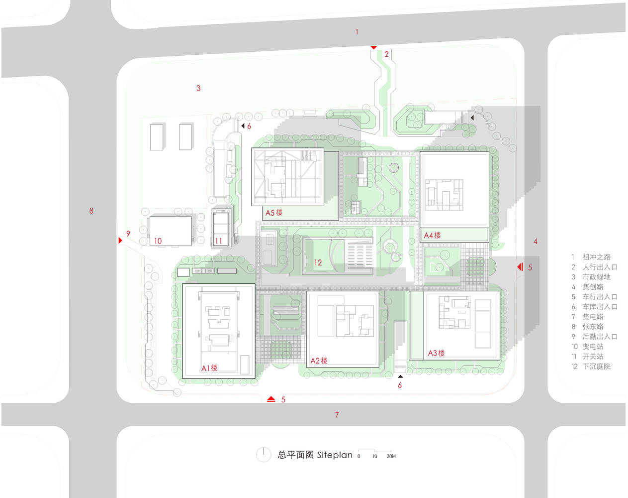 园区车行主入口位于南侧集电路和东侧集创路上,分别正对 A1、A2 楼之间和 A3、A4 楼之间凹入的两处两两相连的廊式共用入口雨棚,并在雨棚前形成回车落客场地。北侧正对 A4、A5 楼之间设置景观广场穿越市政绿带与祖冲之路衔接形成顺应地铁 2 号线广兰路站人流来向的人行主入口。由此在这三处楼间花园各形成一处串联在中央大回廊上的次级小回廊,并与中央回廊一起共同构成园区的人行系统,也同时定义了园区的景观庭院系统。在 A1 楼和已建 35KV 变电站之间设置园区的西向次入口,并将园区的 10KV 市政开关站配建在已建变电站东侧。