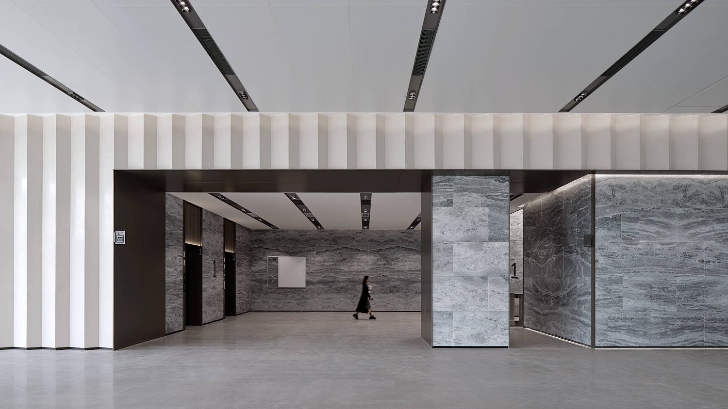 Combining the concise and upright architectural features with a rich sense of variation and sculpture, we have centered our facade design around the concept of "prism". Each building adopts two relatively uniform curtain wall texture types to enhance the overall image characteristics of the park. The main facade texture is a horizontally continuous convex window unit curtain wall with layered horizontal aluminum eaves projected as an equilateral right angled triangle, aligned vertically. The long side of the right angled triangle is a glass curtain wall unit, and the short side is a silver gray aluminum panel curtain wall unit. This creates a shadow effect that is both lightweight and three-dimensional in appearance. On the floor enclosure interface, such continuous concave convex spaces can create distinctive peripheral landscape spaces in relatively homogeneous large office floors, whether used as dedicated workstations in front of windows or as enlarged multifunctional spaces in front of narrow and wide side corridors. Another type of secondary facade texture is the flat all glass curtain wall treatment, which is used on the main entrance hall of the ground floor and the concave exterior of the aerial public layer, respectively, to highlight the transparency of the public space in the semi transparent facade tone with relief and undulations.