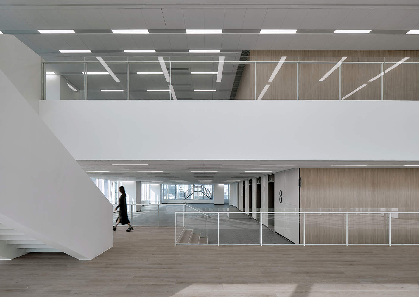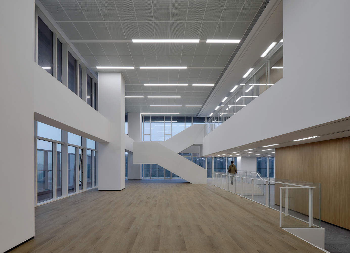 The park is equipped with a three story basement mainly consisting of a garage, and shuttle elevators are provided for each of the five towers to directly reach the lobby on the first floor. There is a large staff canteen on the basement level, providing services for the office population in the park. In the middle of the central courtyard is a lower level garden with large steps, which not only creates natural lighting, ventilation, and a focal point for the staff canteen, but also accommodates an event gathering outdoor theater while facilitating access and evacuation of the canteen. The open pavilion protruding from the west side of the central corridor towards the interior of the central courtyard is the main entrance and exit of the cafeteria, with elevators and stairs leading directly to the cafeteria. The bottom floors of the five towers are all 6.9 meters high to accommodate their respective cantilevered lobbies. The research and development office has a floor height of 4.5 meters, and the floor layout adopts a flexible combination of large depth office space modes suitable for industrial needs. The standard floor area is also large to improve space efficiency. The A1 building adopts a central core tube layout, and the depth of the surrounding office space (including corridors) reaches 14 meters. The remaining four buildings adopt a biased core tube mode, with generally larger office space depths.