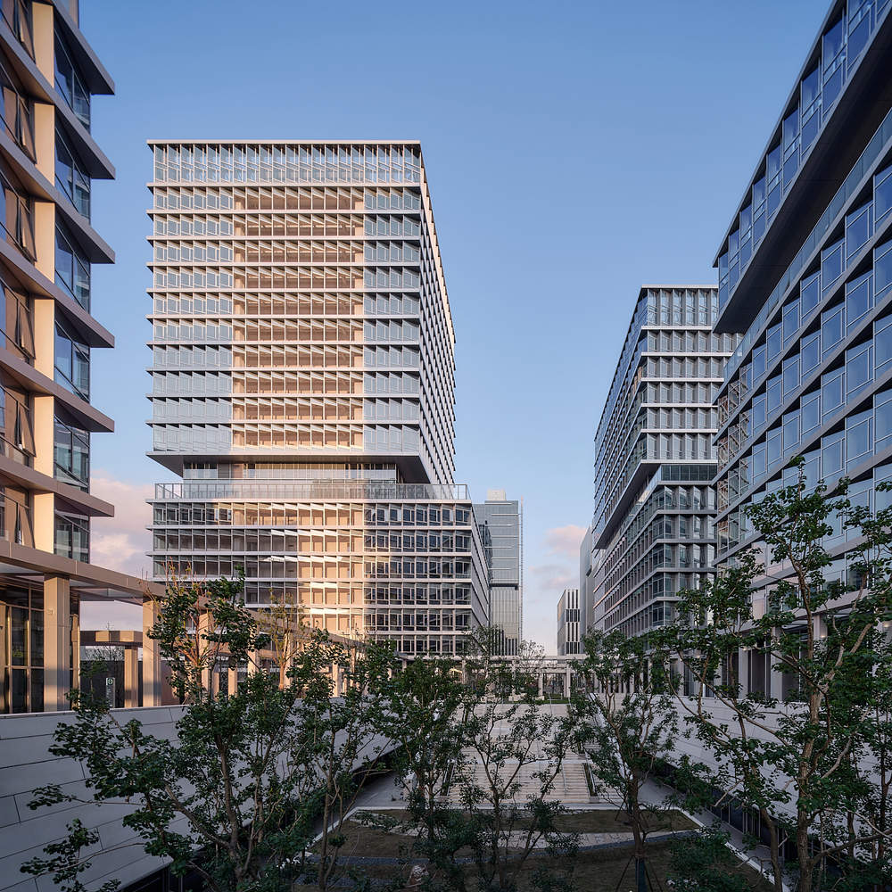 The Chuangxin Tiandi project of the 3-2 information technology industry platform in Zone B of Zhangjiang Jidian Port is a research community with integrated circuit science and technology innovation research and development as its main function. The park is located at the southeast corner of the intersection of Zuchongzhi Road and Zhangdong Road, occupying the entire block limited by urban roads except for the original 10KV power facility in the northwest corner. However, a 35KV substation has been built within the red line of the park adjacent to the southern boundary of this power facility. The park is positioned as open, shared, vibrant, and gathering, focusing on creating a vibrant park, a showcase for scientific research and culture, an innovative and inclusive workplace, a multi-dimensional and interconnected communication space, and a sustainable research and development environment. When the preliminary plan research for the plot began in 2015, the planned plot ratio was still 2.0. At that time, the plan was still based on the spatial layout logic of high and multi story mixed use of large and small R&D buildings. When the implementation plan was launched in 2019, it coincided with the regulation and capacity expansion adjustment of the entire Zhangjiang East District, and the plot ratio of the land was increased to 4.0. Therefore, the cluster of high-rise and large-scale R&D buildings naturally became the best choice for product positioning in the park. In order to create an open and green neighborhood environment in a high-intensity development environment, the overall layout is designed to minimize building density. A group of independent towers without podiums is adopted to highlight the height of the buildings. Five high-rise R&D towers with staggered heights are arranged in a windmill shape along the perimeter of the neighborhood, forming a central courtyard, and landscape corridors are set up around it to connect the five towers.