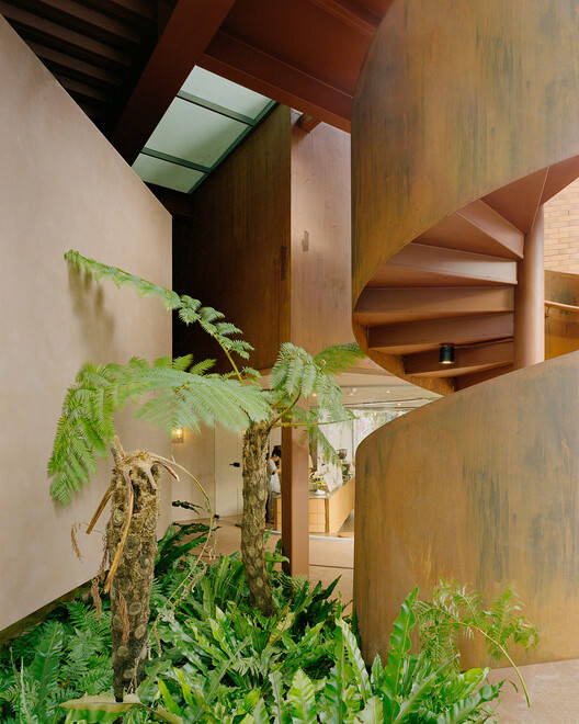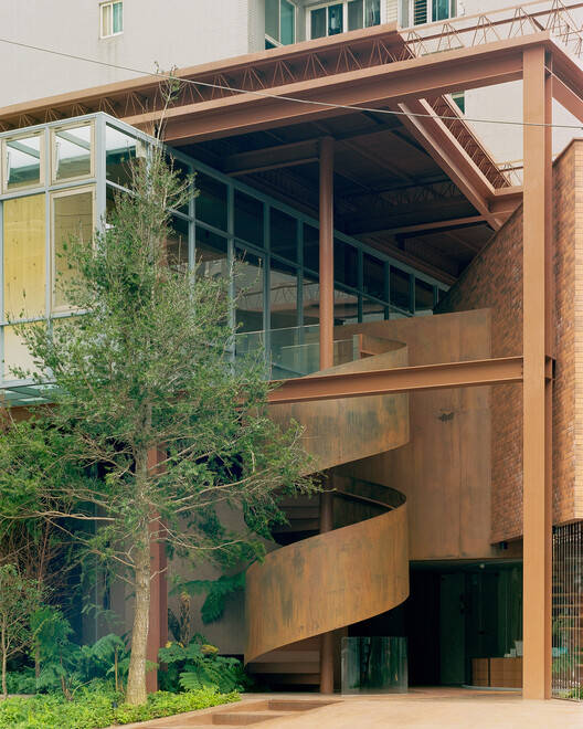 在这家开发商的总部,工厂的钢架结构勾勒出整体布局轮廓,与其砖窑发源地的历史渊源遥相呼应。空间经过解构并依次巧妙嵌入。设计摒弃了传统的商业氛围,转而强调“对社区开放”的理念,与公众共享品牌愿景,将重新诠释的工厂美学与台湾森林意象巧妙融入城市肌理之中。