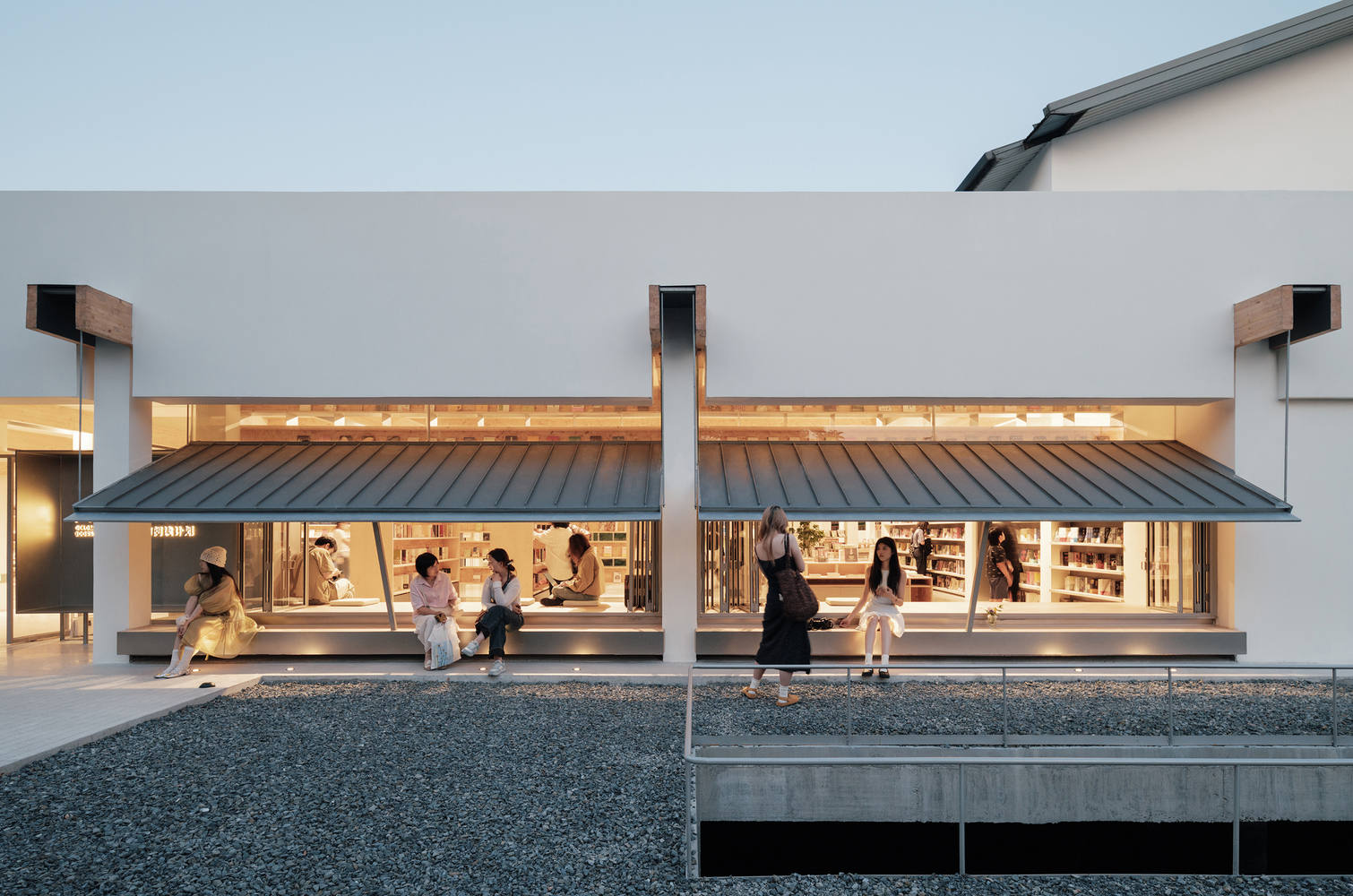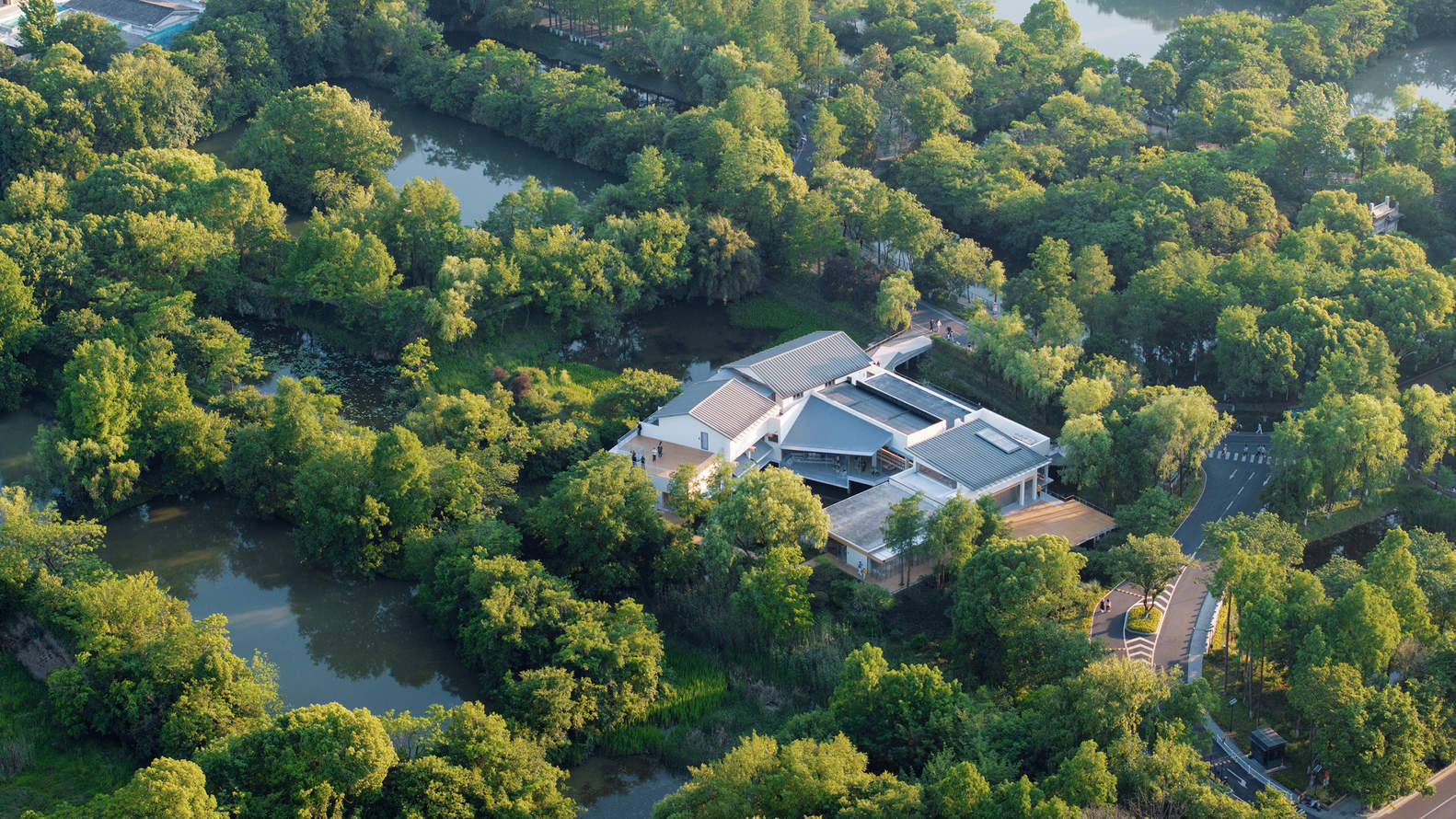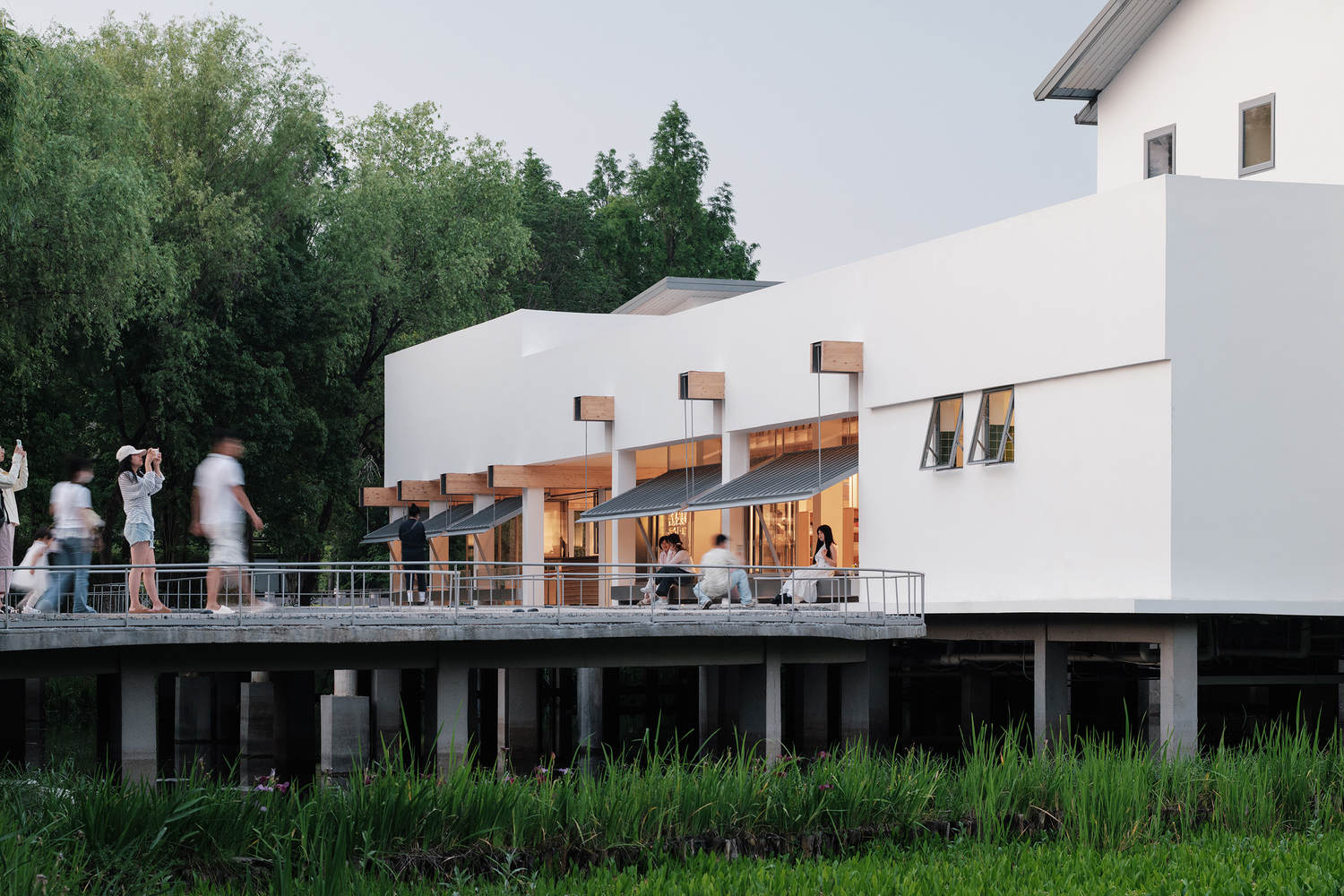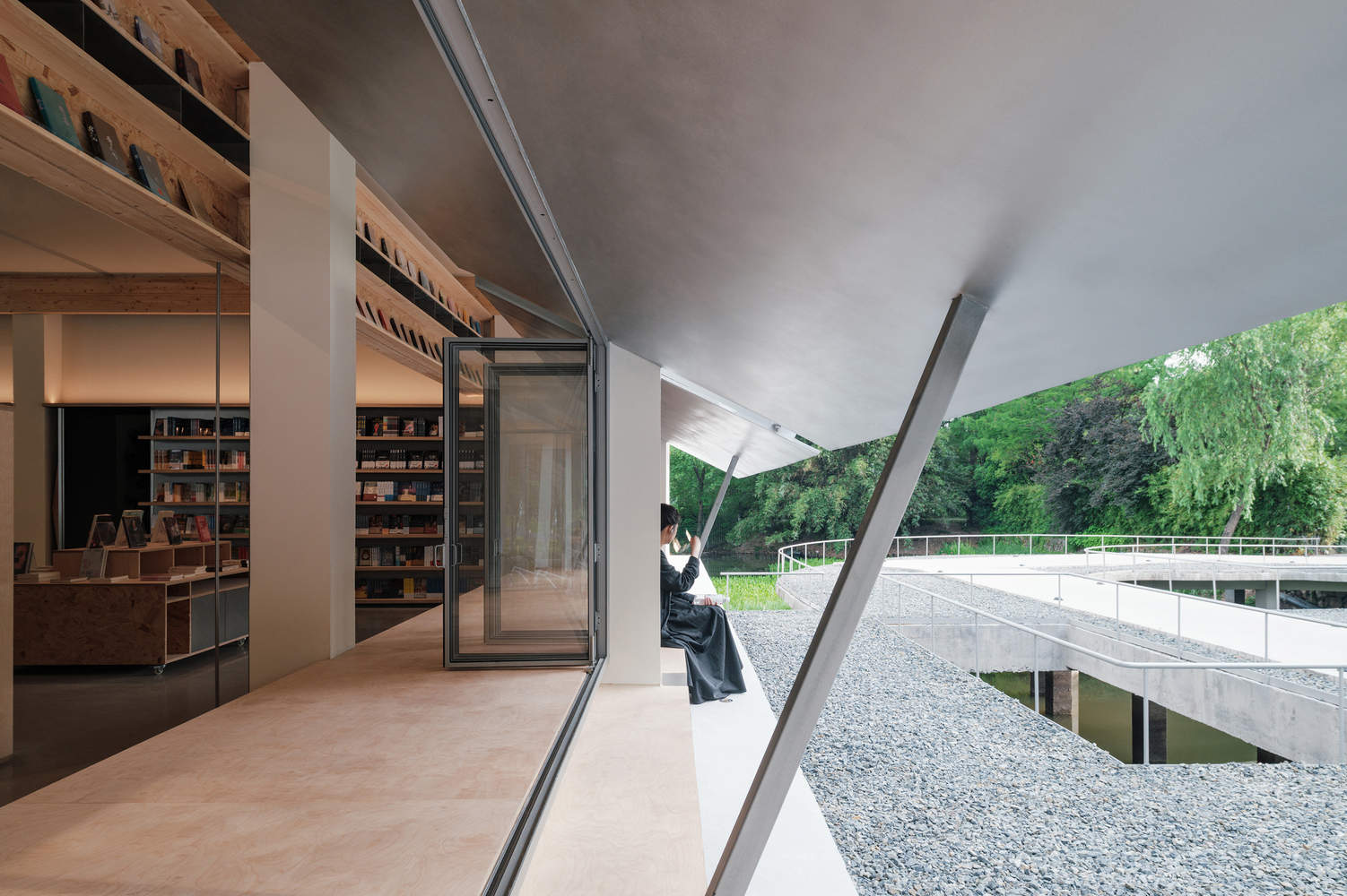 As an intermediary element of the building's adjacent water boundary, eaves have two functions. One is to adjust the indoor lighting, while blocking the glaring direct sunlight, the silver ceiling provides soft diffused light, forming a more suitable indoor space for reading; The second is to adjust the spatial scale, with the lowered eaves blocking out the interference of tourists from Fudi and the two wings of the water courtyard, allowing people's indoor gaze to be directed downwards towards the wetland water surface, enhancing the perception of the building being elevated above the water. The overhanging eaves of wooden beams, the elevated table and chair components between columns, the three-dimensional staggered glass interface, and the foldable windows that can be fully opened together form multiple intermediary fields between architecture and nature.