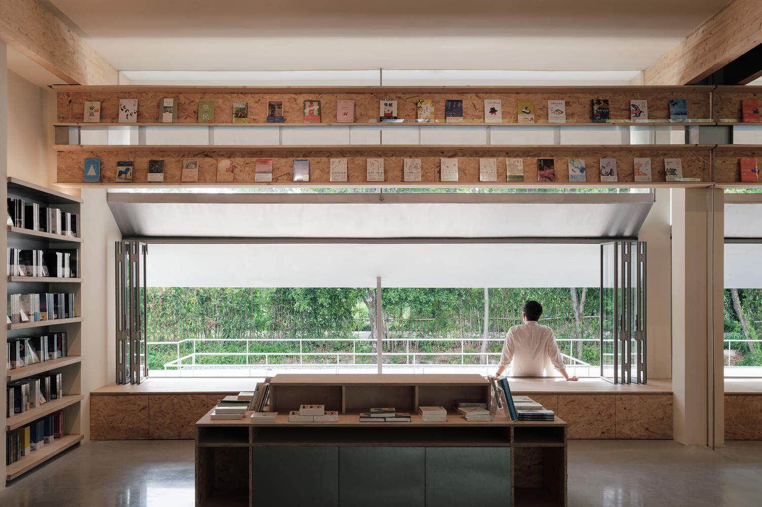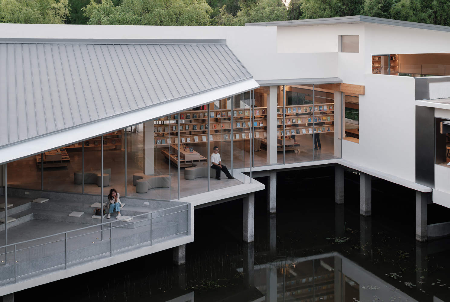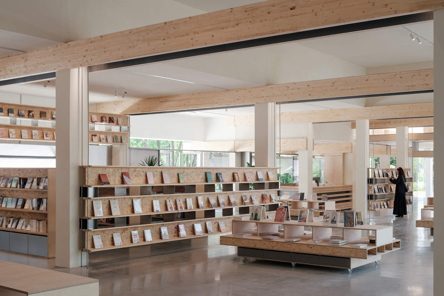 The six sets of book beams are staggered in height between the columns, forming a rich spatial interlocking effect with the wooden beam group. They float in the white space, defining a group of fields with ambiguous boundaries and open to nature. Xixi Wetland, as a secondary urban wetland in Hangzhou, is a place for nearby residents to take daily walks and ride bicycles. We have built a transparent and open bookstore on the wetland, allowing people to read books and nature at the same time, becoming a public place embedded in the natural life of the city.